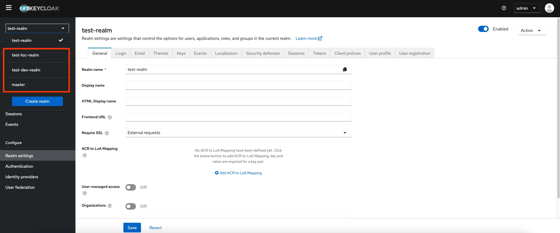 - 아래와 같이 로컬 환경에서의 ‘test-loc-realm’과 개발 환경에서의 ‘test-dev-realm’으로 물리적인 분리를 하여 물리적인 공간을 분리하여 realm으로 관리할 수 있습니다.