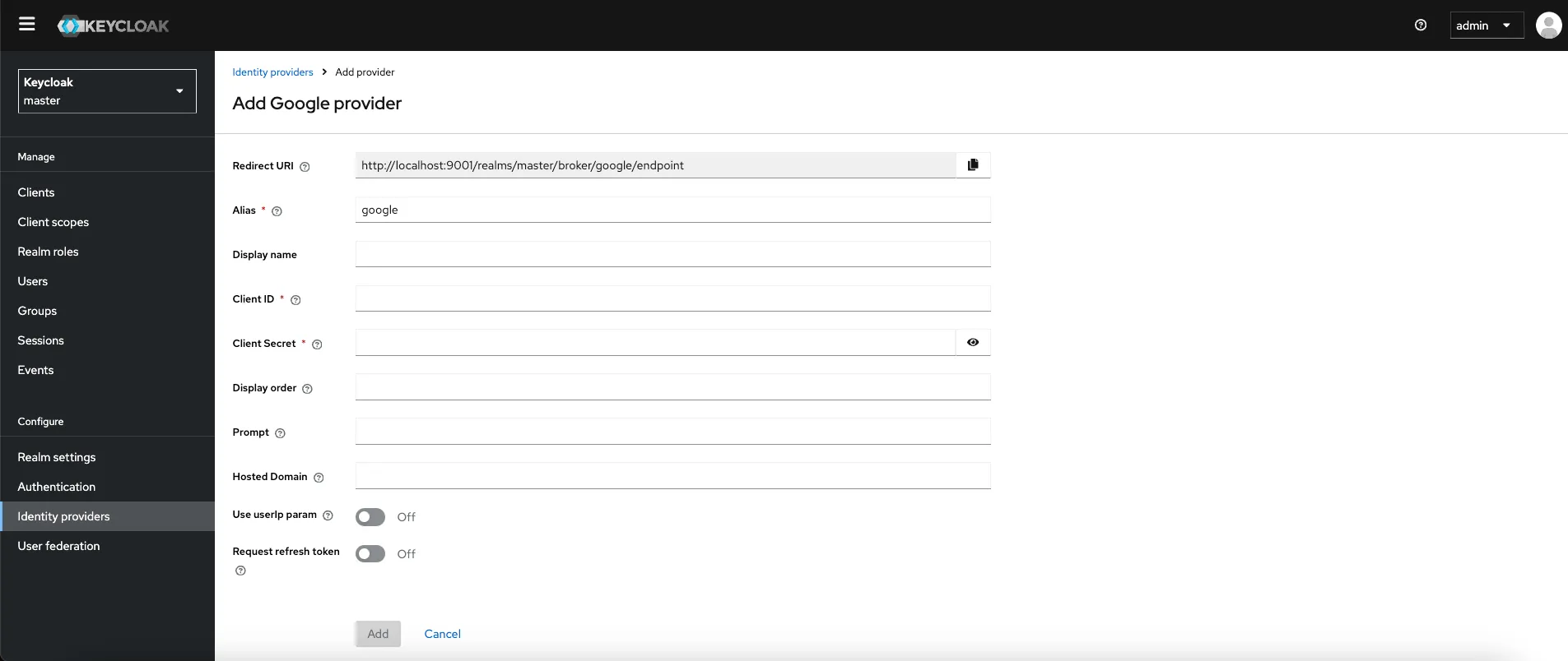 💡 [참고] 인증 중계(Identity Brokering) 및 소셜 로그인을 구성하는 관리자 페이지입니다. : Identity provider