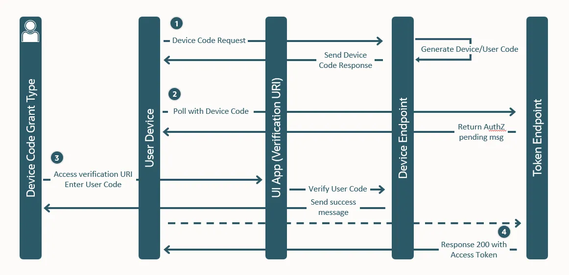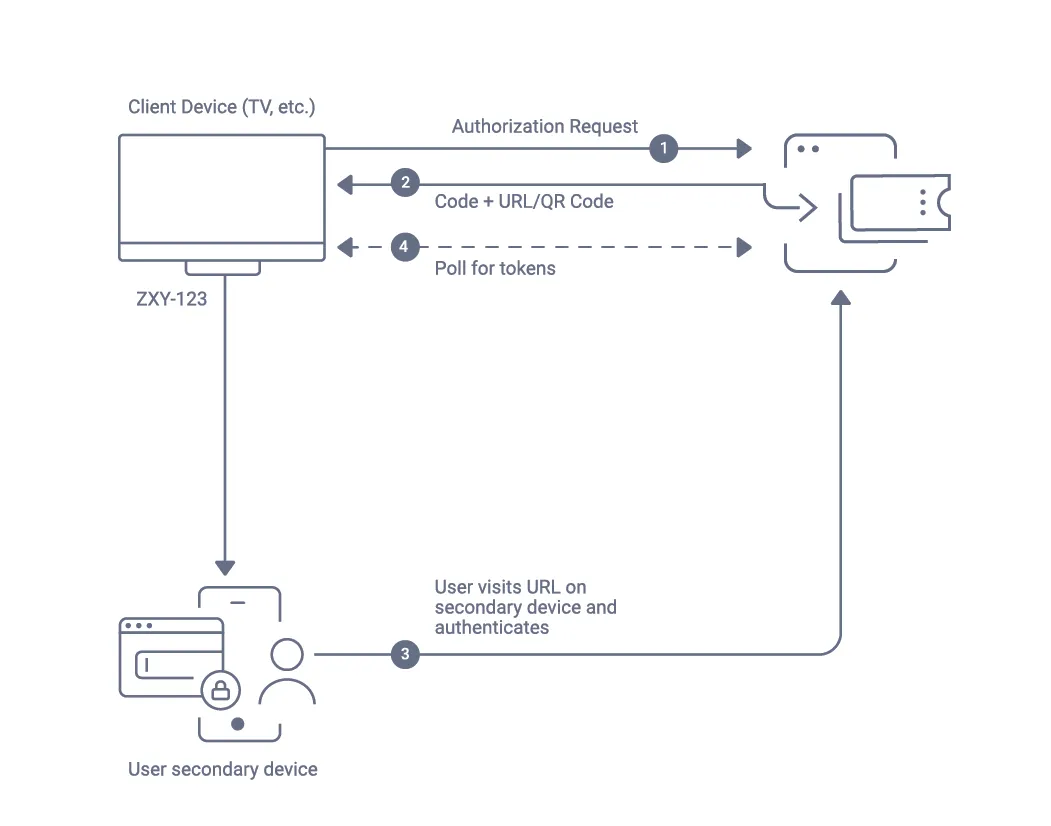 - 입력 기능이 제한된 디바이스(IoT 기기, 스마트 TV)와 같은 디바이스에서 사용되는 인증 방식을 의미합니다. - 사용자는 디바이스로부터 제공받은 사용자 코드와 함께 검증 URL을 다른 기기에서 입력함으로써 간편하게 인증을 완료할 수 있습니다. - 스마트 TV 애플리케이션, IoT 디바이스, 게임 콘솔, 프린터 및 스캐너 등에서 사용합니다.
