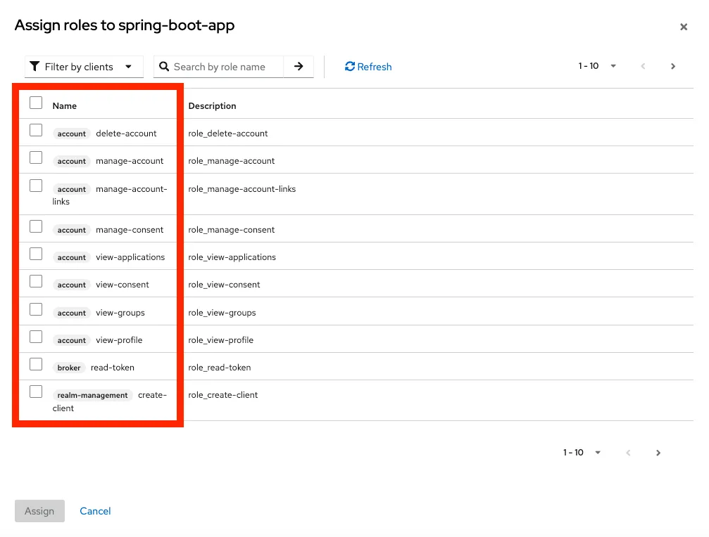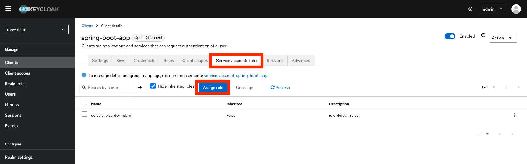 1. 클라이언트 등록 및 설정 - Keycloak 관리 콘솔에서 클라이언트를 등록하고 Service Account Roles를 활성화하여 사용합니다. - Assign role 버튼을 눌러서 필요한 역할(roles)과 권한을 클라이언트에 할당하여 설정합니다.