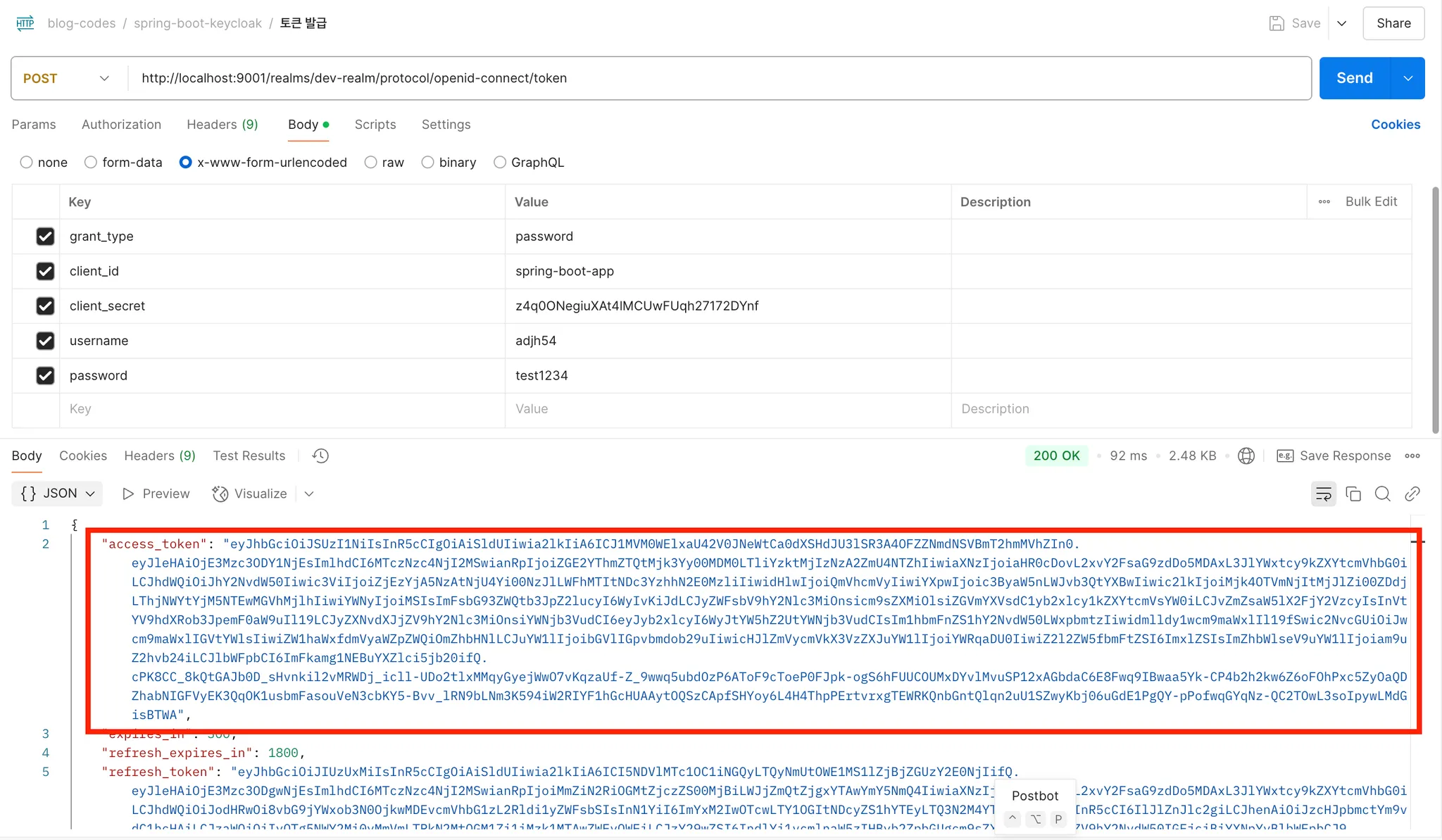 💡 [참고] Postman을 통해서 Keycloak 엔드포인트로 호출을 하면 아래와 같이 즉시 access_token, refresh_token을 반환받을 수 있습니다.