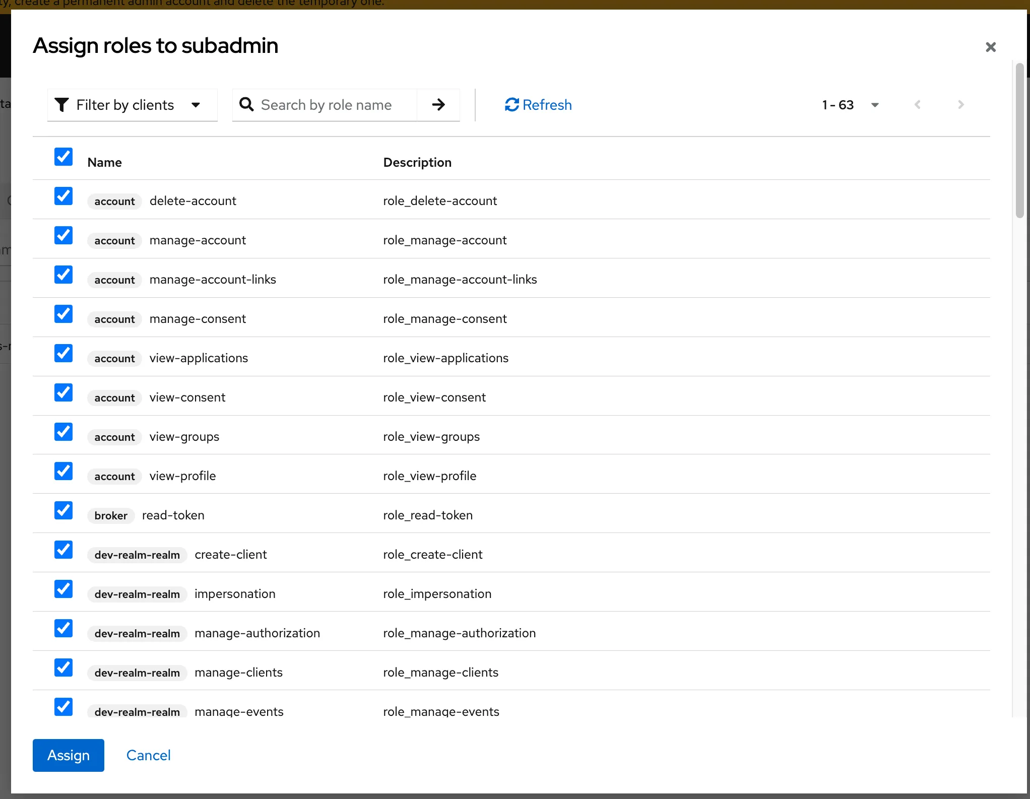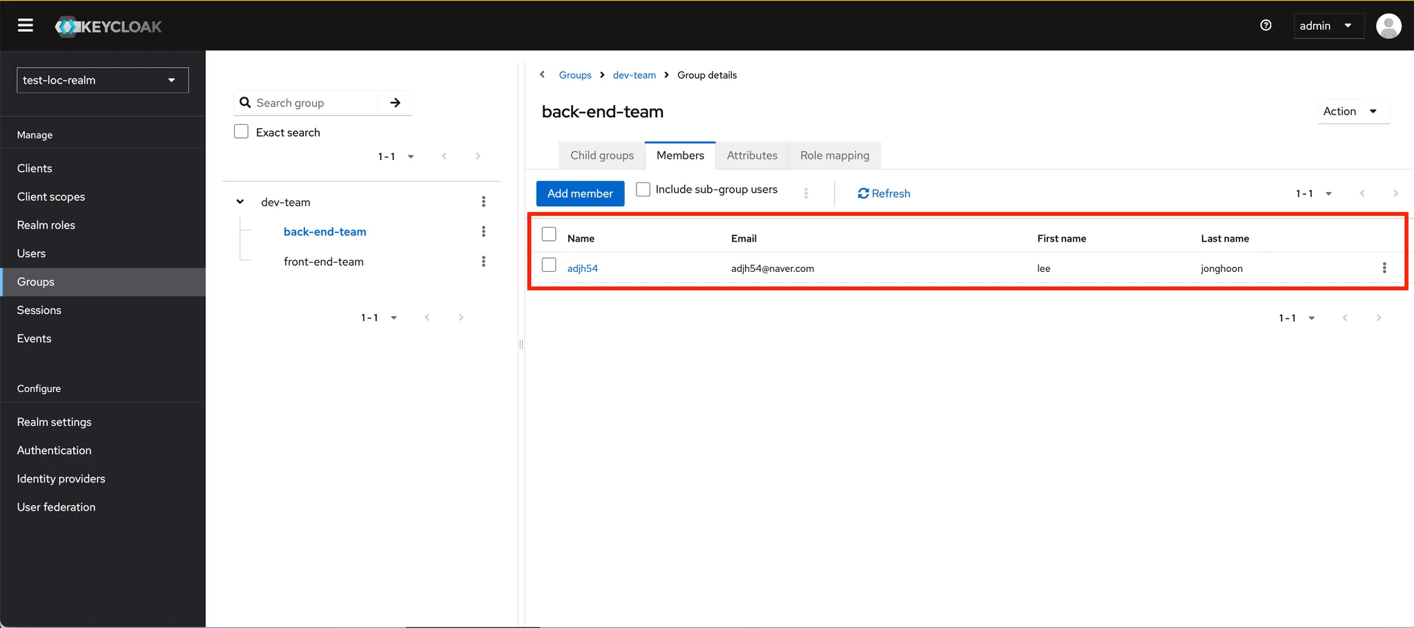 - Include groups and roles : 그룹 및 역할을 포함한 - export - Include clients : Client를 포함한 export