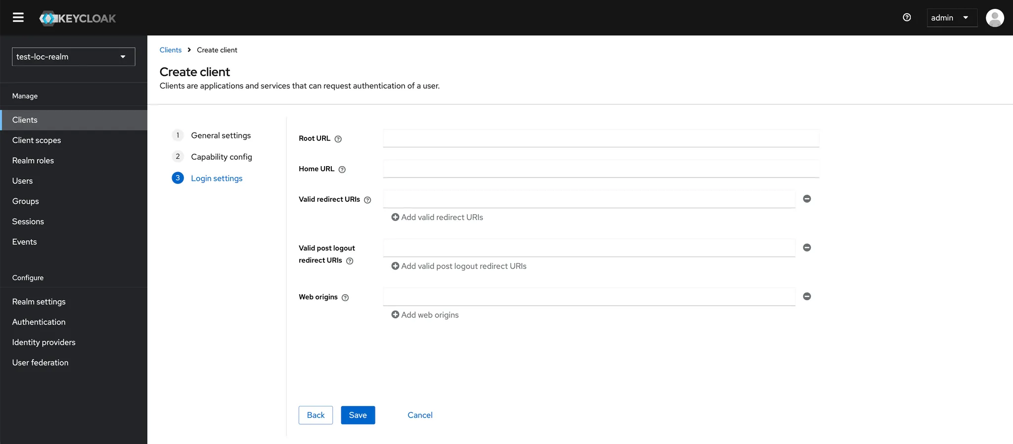 - 새롭게 구성한 realm 내에 client를 생성합니다.