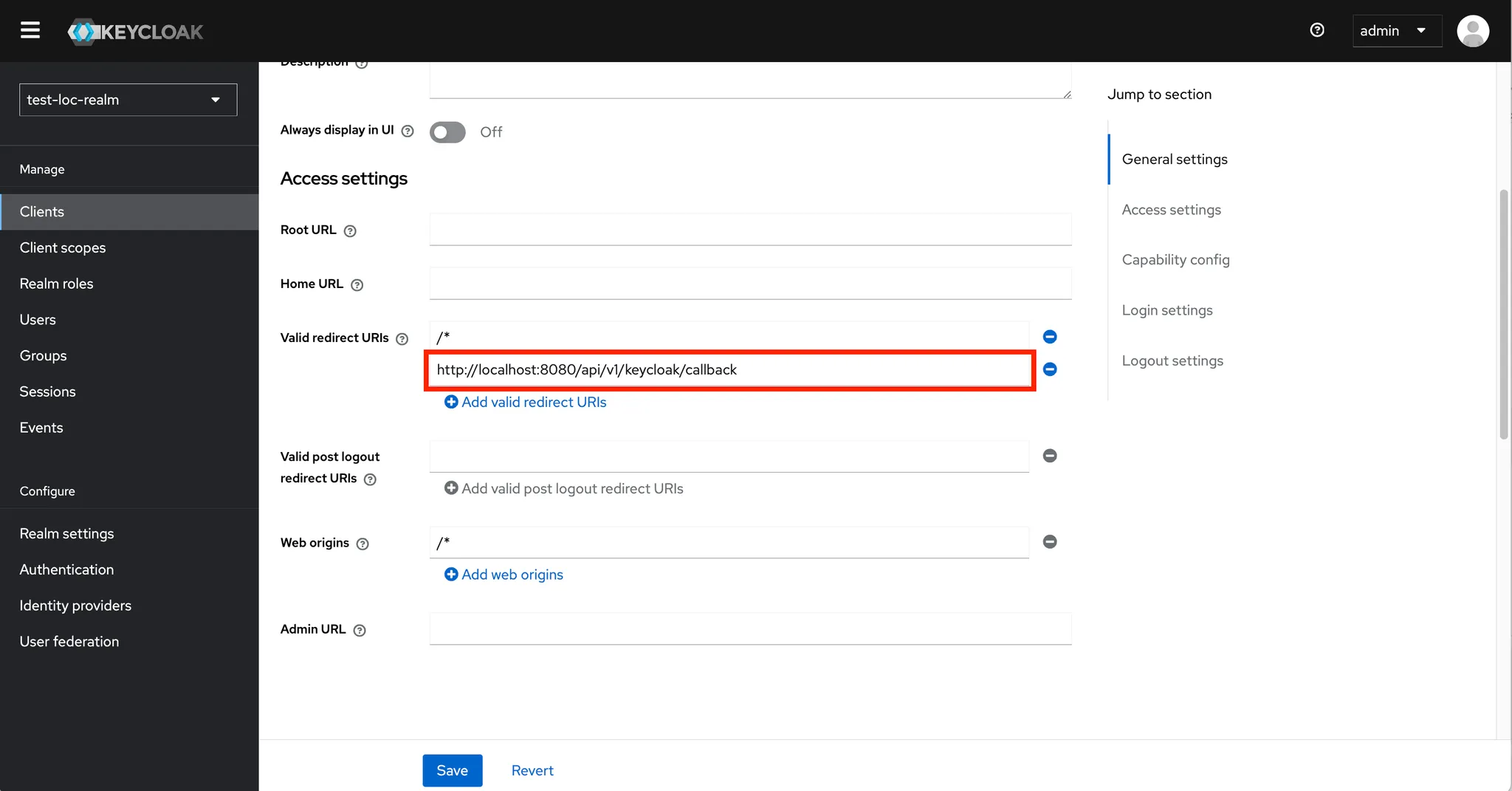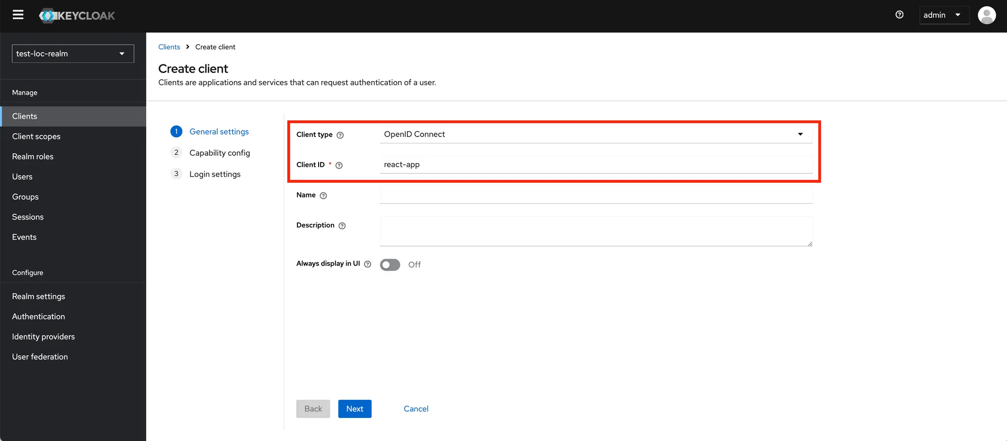 - 구성한 Realm내에 애플리케이션 또는 서비스에 해당하는 Client를 생성합니다.