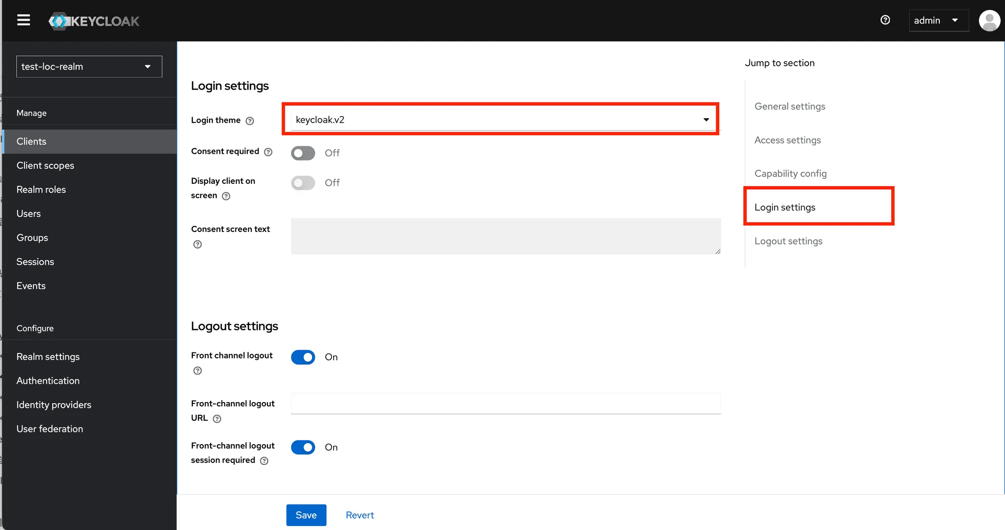 - 위에 구성한 경로로 접근하였을때 test-loc-realm이라는 realm에 접근하는 로그아웃 화면이 출력되었습니다.