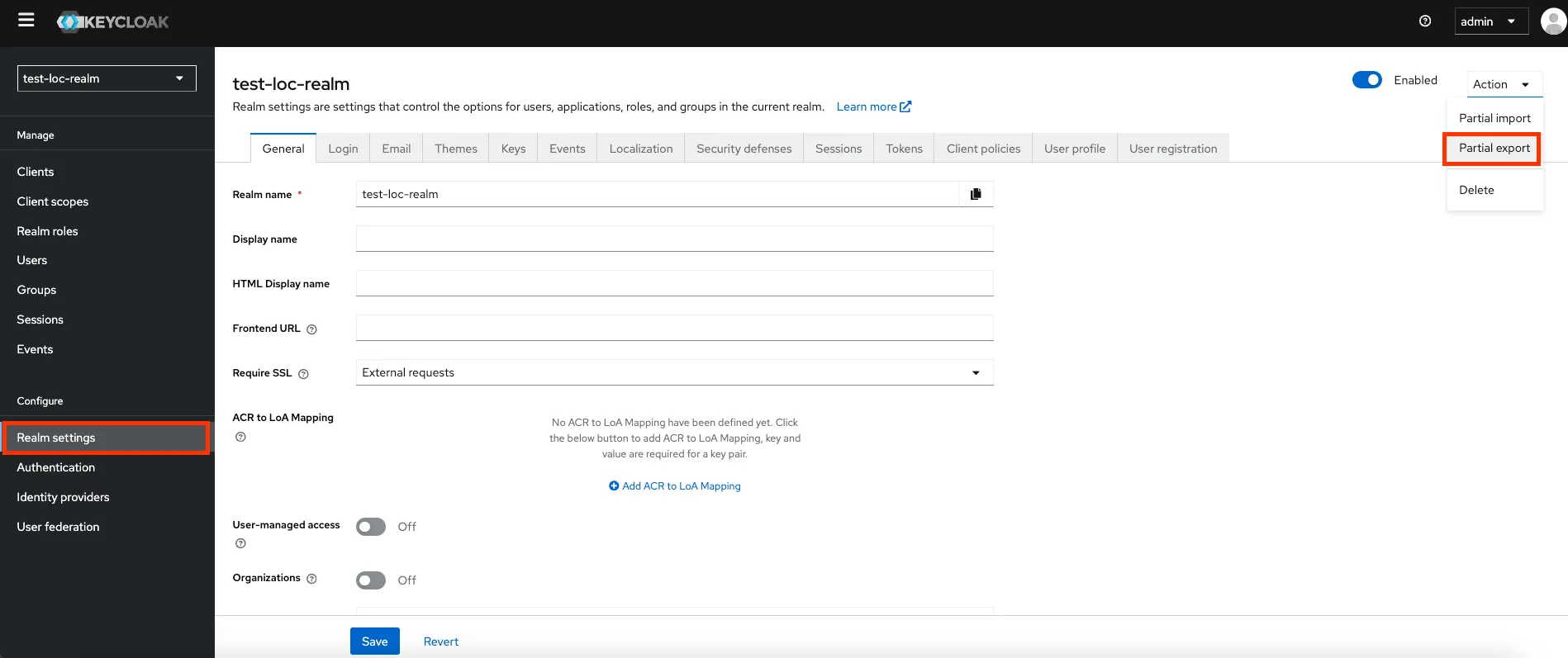 💡 [참고] Realm settings > Action으로 이동하면 기존의 Realm에 대한 정보가 export가 됩니다.