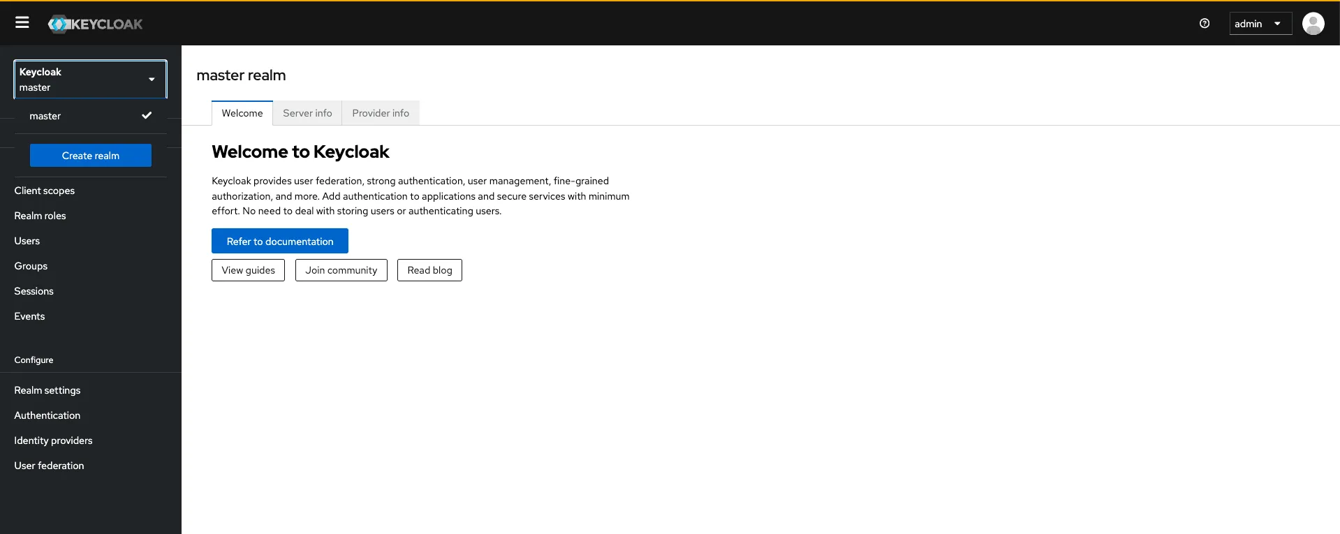 - Docker에서 지정한 포트를 기반으로 접근하여, 최초 지정한 아이디/패스워드인 ‘admin/admin’을 입력하면 아래와 같이 관리자 페이지가 출력이 됩니다. - 최초 접근을 하면 master realm이 구성됨을 확인할 수 있습니다. 이는 독립적인 영역인 realm으로 생성이 되었습니다. - 이 과정에서 새로운 realm을 구성해봅니다.