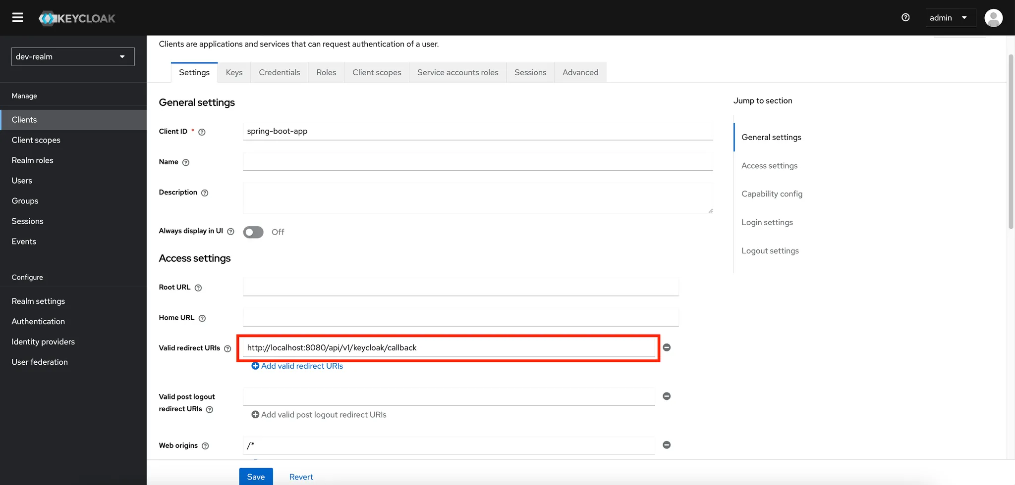 - Realm 선택 > Clients 탭 > Client 선택 > Settings 탭 > Access settings 메뉴 중에서 Valid redirect URL로 리다이렉트 될 URL을 지정합니다. - 해당 설정은 사용자에게 Keycloak 로그인 페이지를 제공하고, 로그인에 성공하였을 때 지정한 Valid redirect URIs를 통해 리턴되어서 결과 값을 반환받는 형태로 사용이 됩니다.