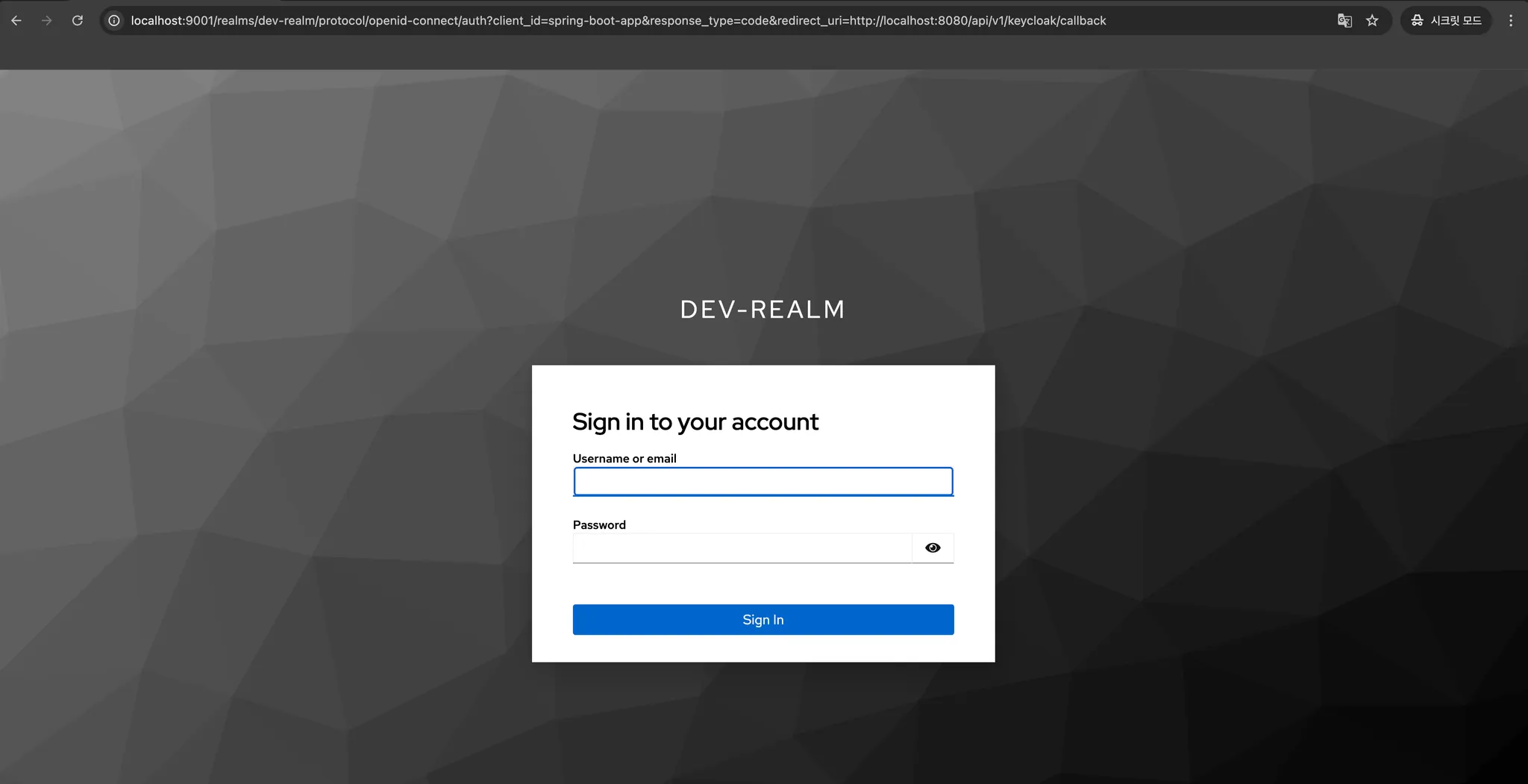 - http://localhost:9001/realms/dev-realm//protocol/openid-connect/auth 엔드포인트로 “application/x-www-form-urlencoded" 데이터 형태로 전달합니다. - 해당 서비스 호출을 최종적으로 HTML 페이지가 출력이 됩니다.
