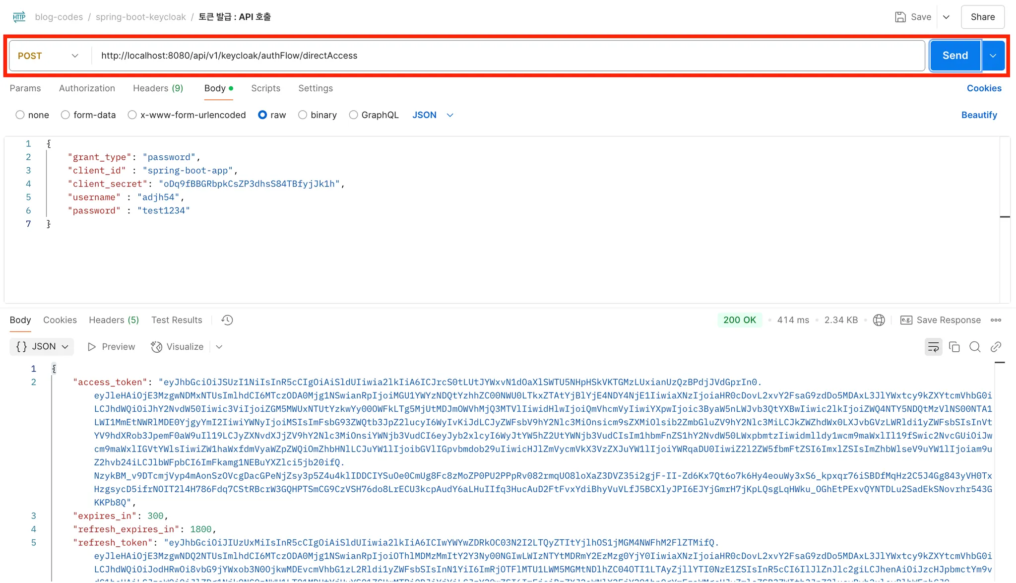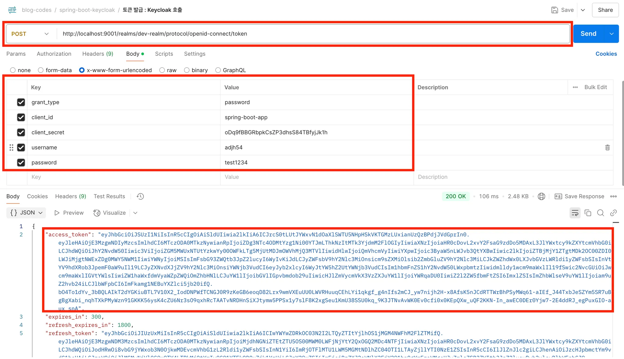 - http://localhost:9001/realms/dev-realm/protocol/openid-connect/token 와 같은 특정 Realm로 토큰을 요청합니다. - 파라미터로 grant_type, client_id, client_secret, username, password 값을 실제 전송하여서 토큰을 받아오는 방식입니다.