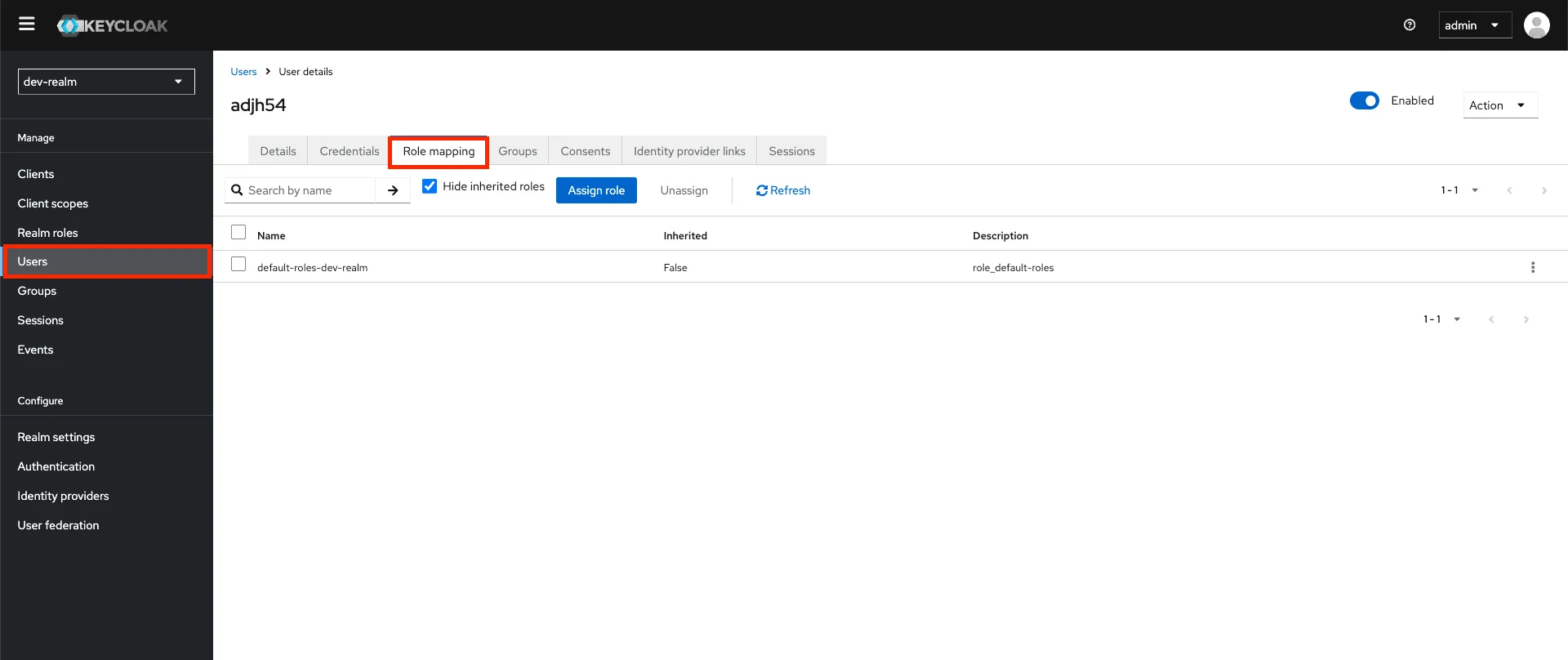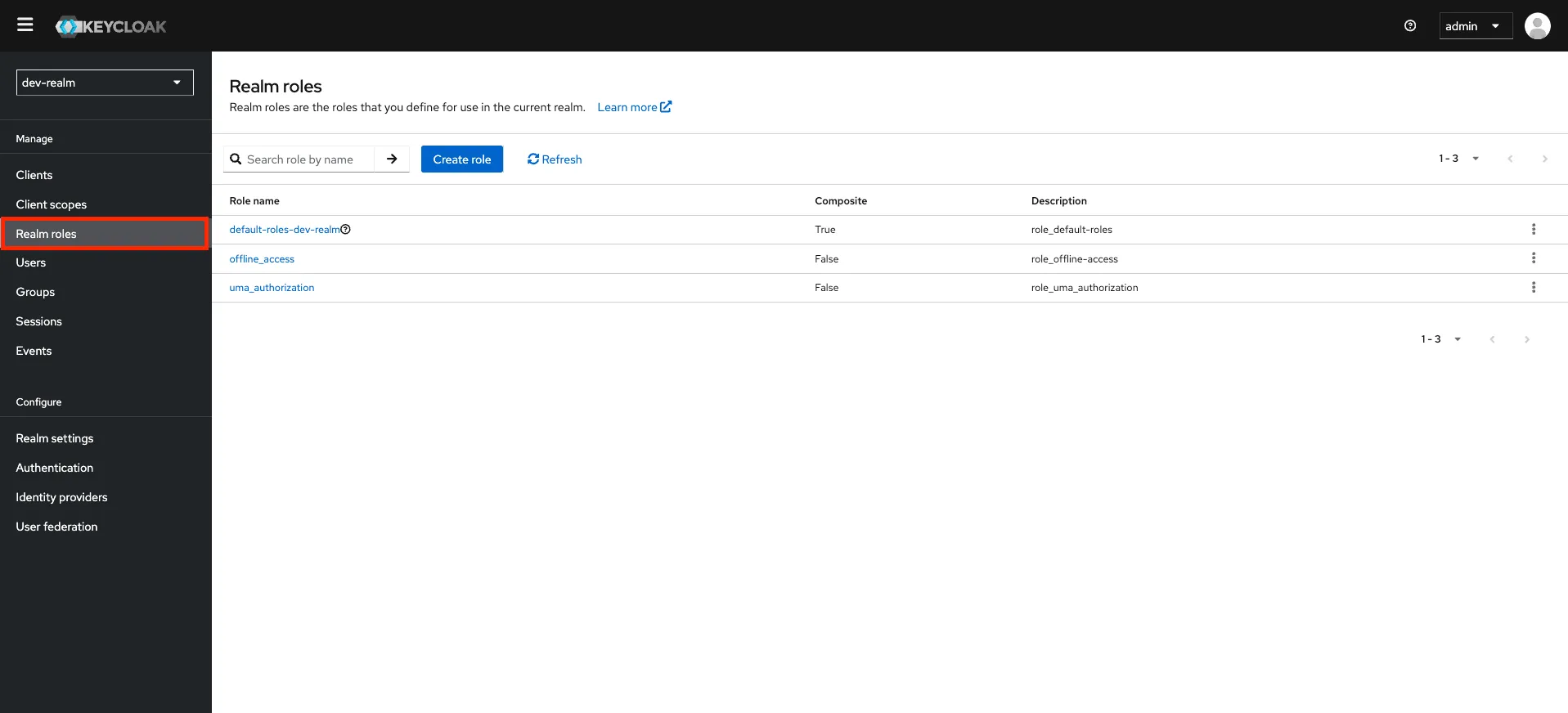 - Realm 내의 전체 영역에서 공통적으로 사용되는 역할로, 모든 클라이언트에 적용이 가능합니다. - Realm > Realm roles 내에서 Realm에 대한 역할을 부여할 수 있습니다.