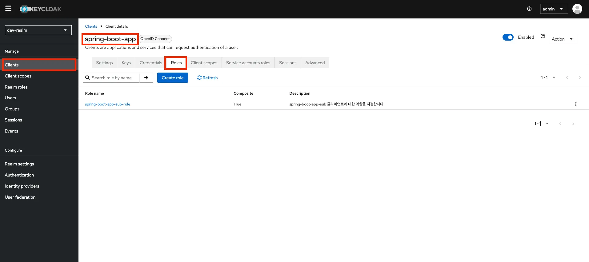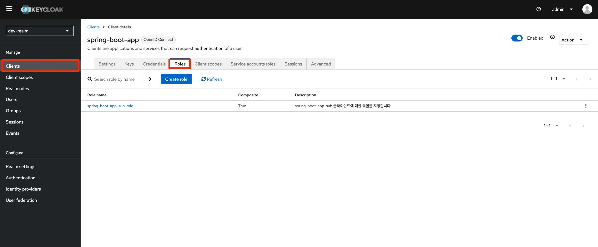 - 특정 클라이언트 애플리케이션에서만 사용되는 역할로, 해당 클라이언트 내에서만 유효합니다. - Clients > Client 선택 > Roles 탭 내에서 클라이언트 단위에 역할을 부여할 수 있습니다.