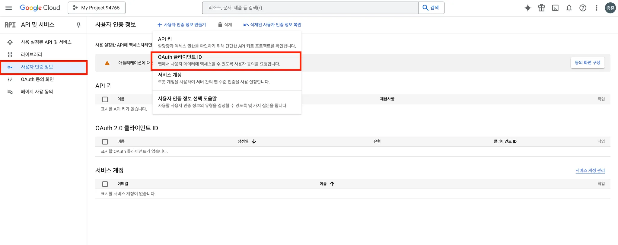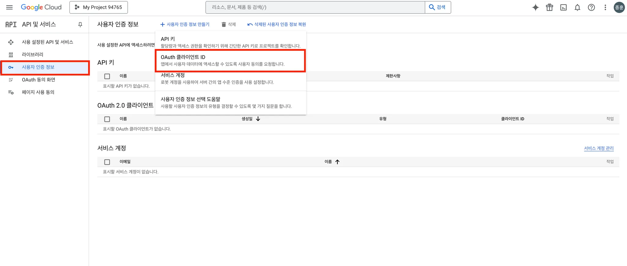 2. 사용자 인증 정보 > 사용자 인증 정보 만들기 > 'OAuth 클라이언트 ID'를 선택합니다.
