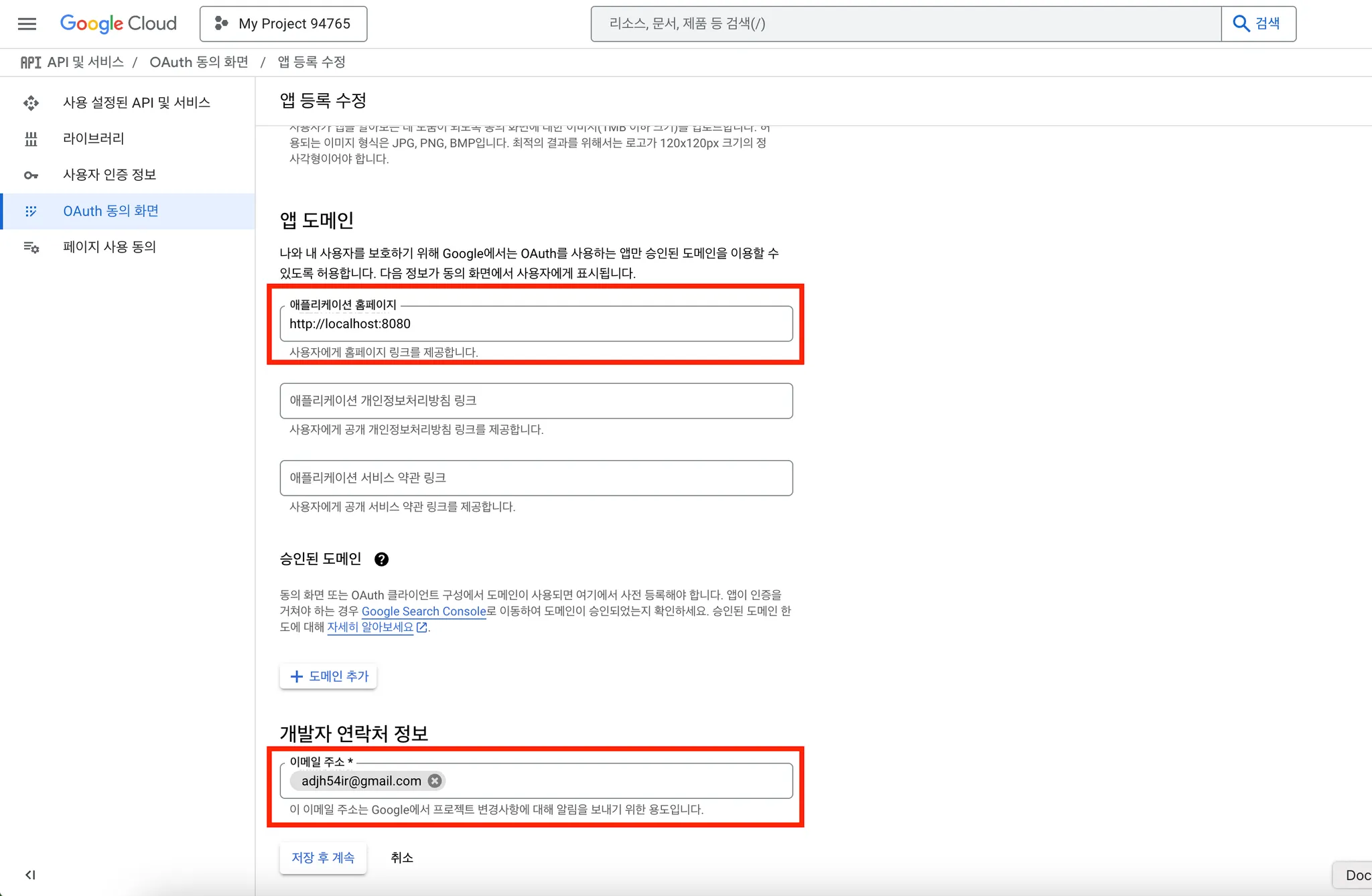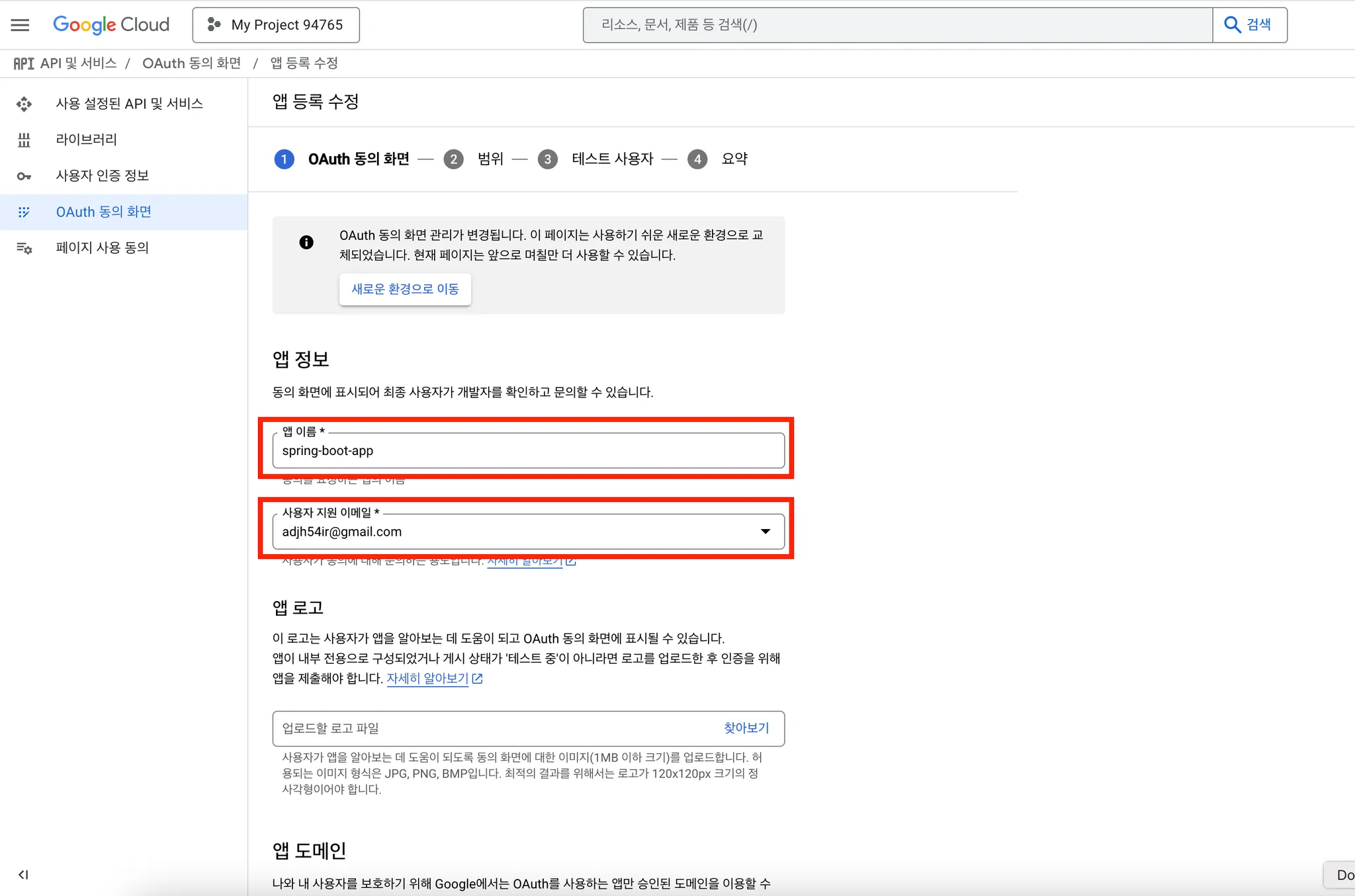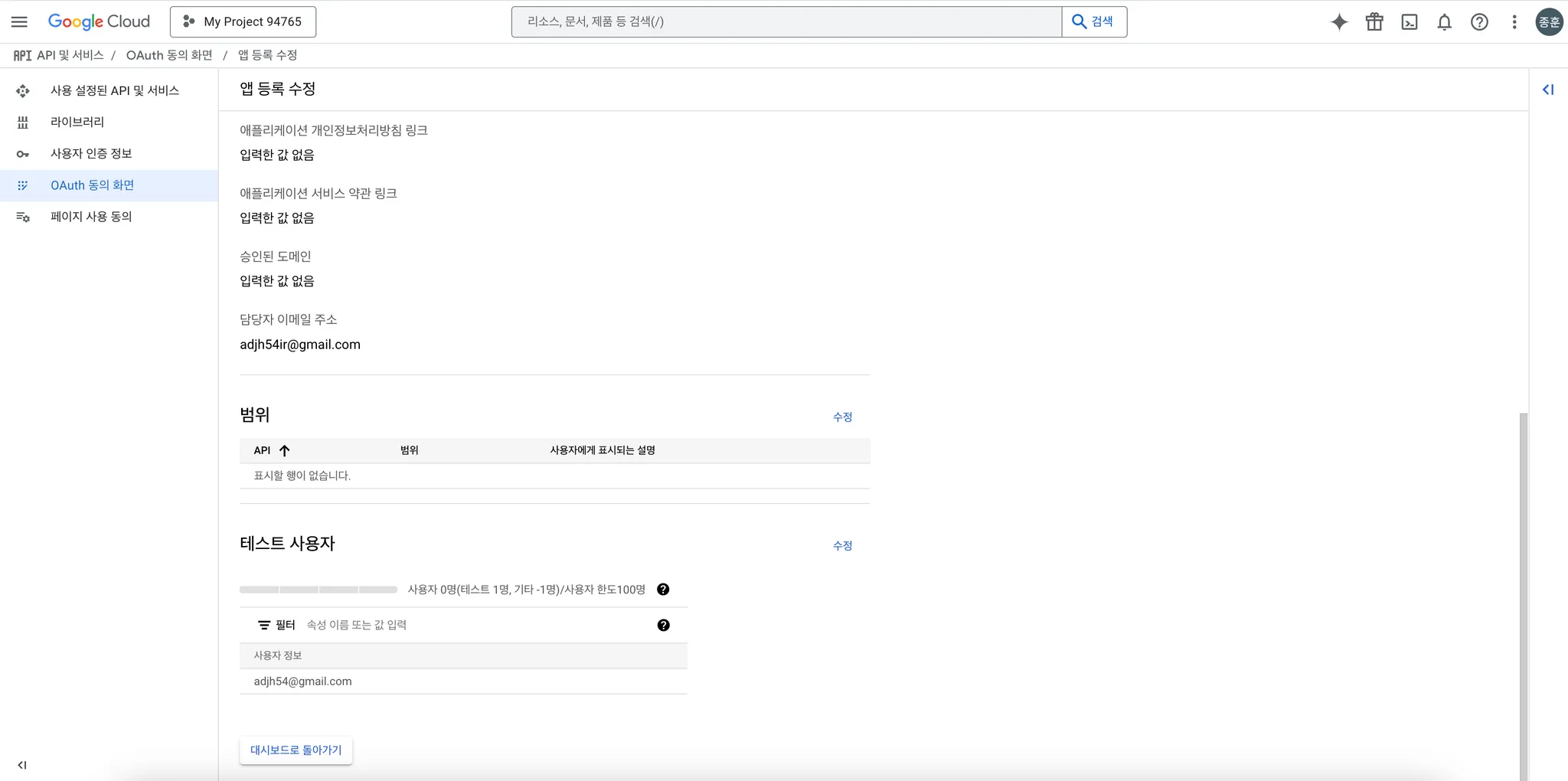 5. 앱 등록 수정 -1 > OAuth 동의화면 > 필수 선택 사항만 입력을 합니다.