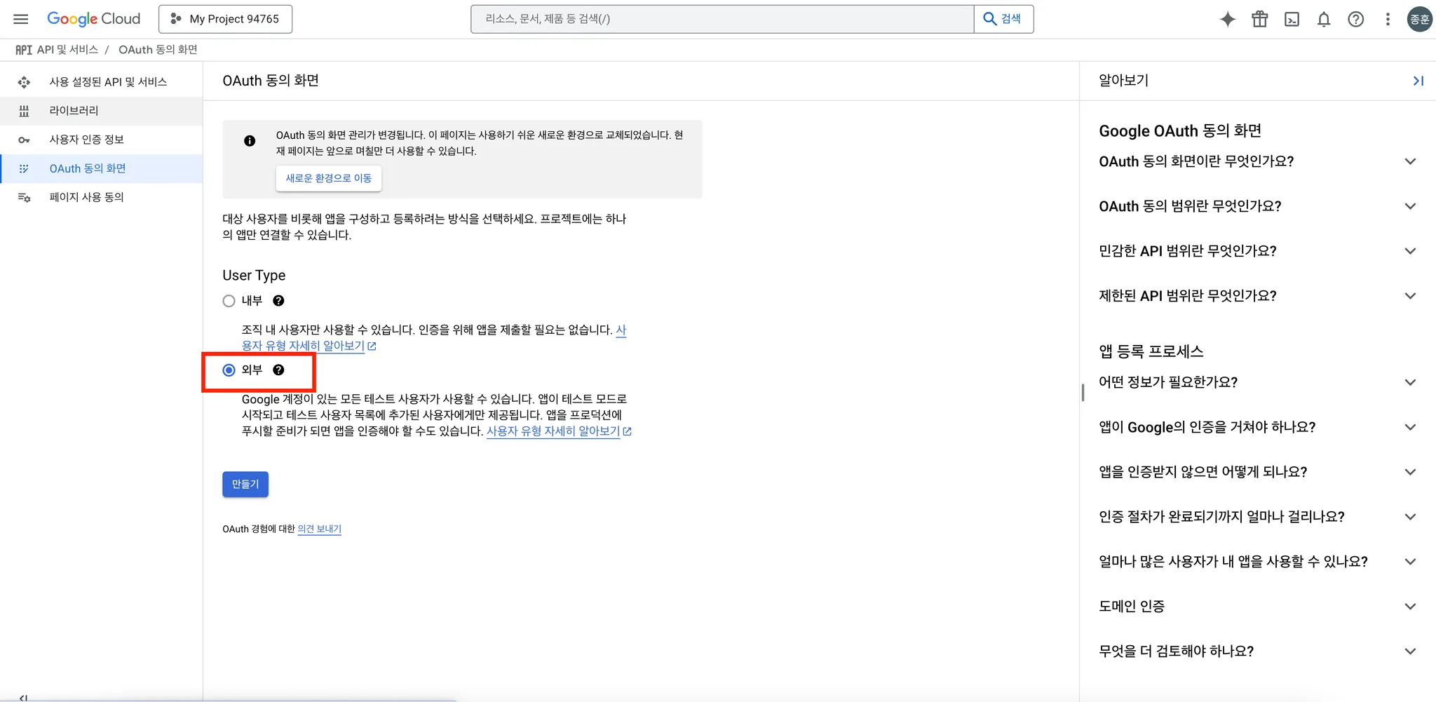 4. ‘외부’를 선택하고 User Type을 선택한 뒤 '만들기' 버튼을 누릅니다.