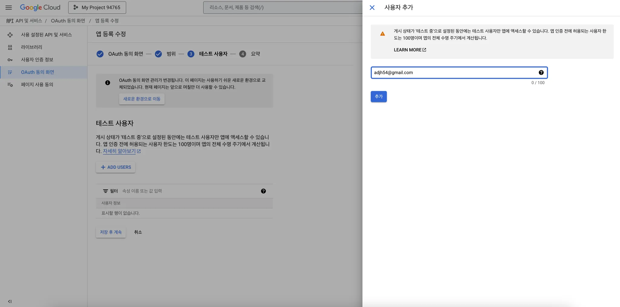 💡 앱 등록 수정 > 테스트 사용자 > 테스트 사용자를 입력합니다.
