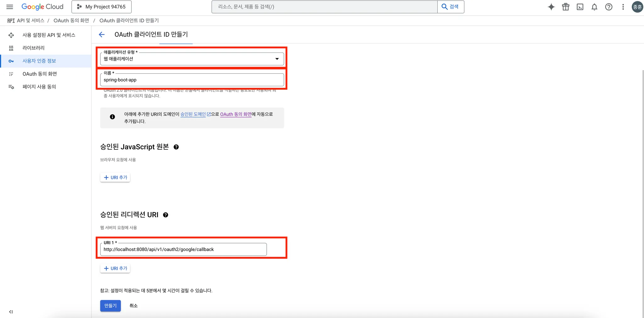 11. OAuth 클라이언트 ID 만들기 > 주요 값들을 선택하고 로그인 성공시 리다이렉트 되는 URL을 입력합니다.