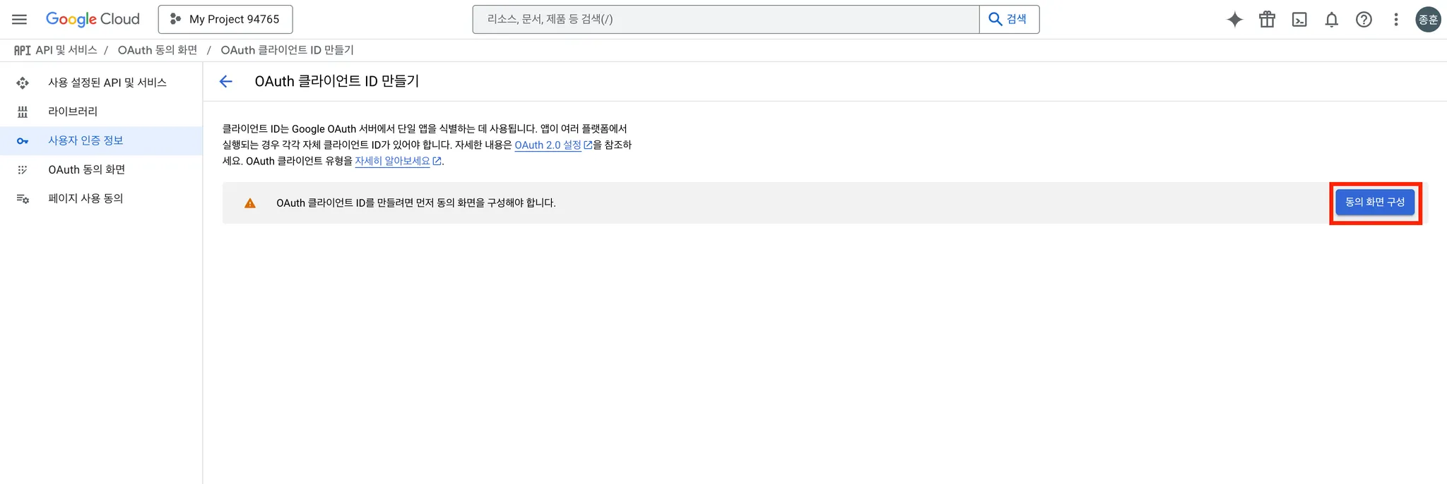 3. '동의 화면 구성' 버튼을 누릅니다.