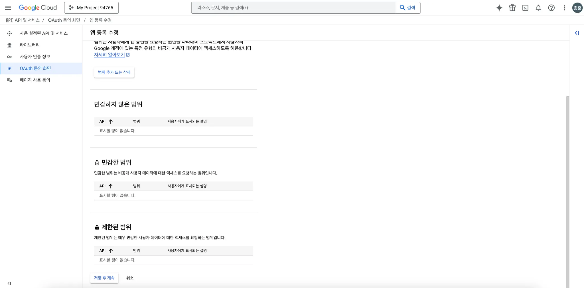 7. 앱 등록 수정 > 범위 > 저장 후 계속 버튼을 누릅니다.