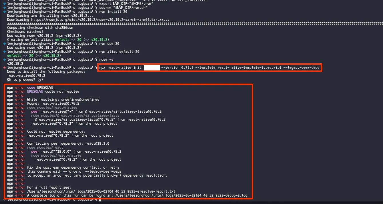 - 동시에, --version 0.79.2를 명시했기 때문에 react-native@0.79.2 + react@19.1.0 조합을 요구합니다. - 이 두 조합은 npm의 peer dependency 시스템에서 충돌한다고 판단해 설치를 중단합니다. - 즉, npx가 react-native CLI를 최신으로 가져오면서 내부적으로 잘못된 의존성을 설치하려 해서 문제가 발생한 것입니다.