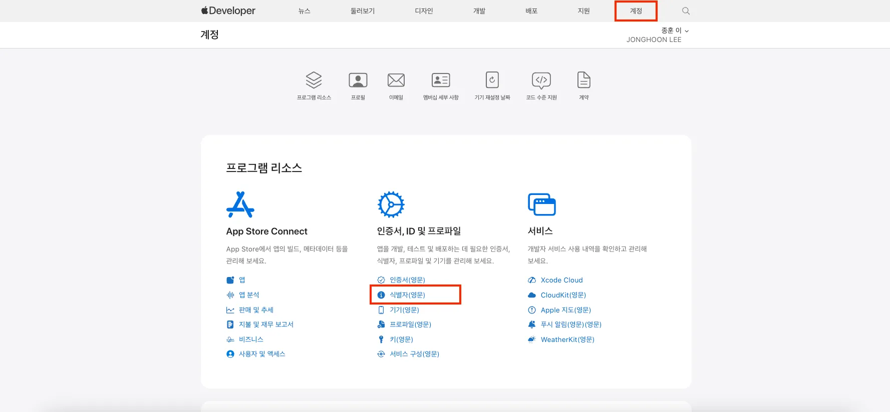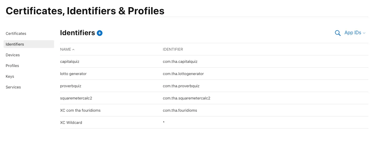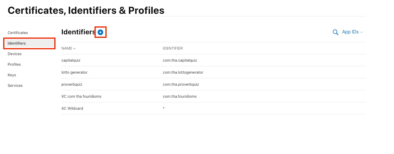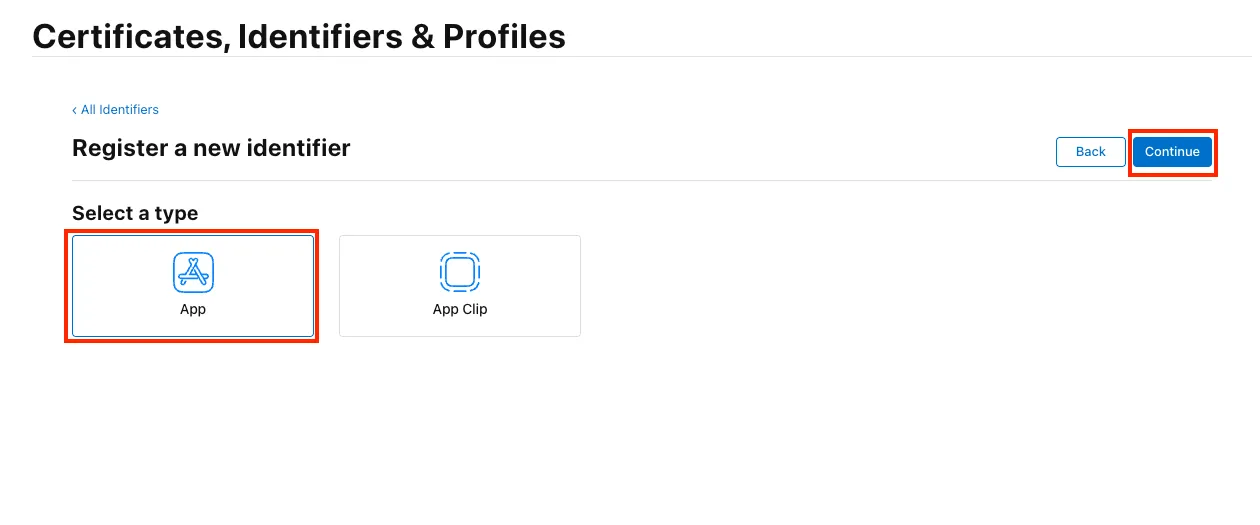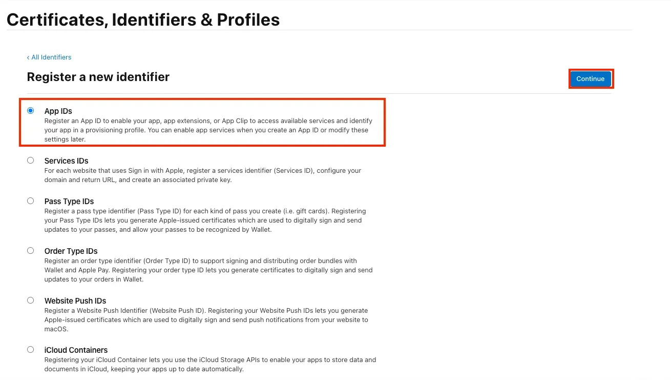 4. Register a new identifier > App IDs > Continue 를 선택합니다