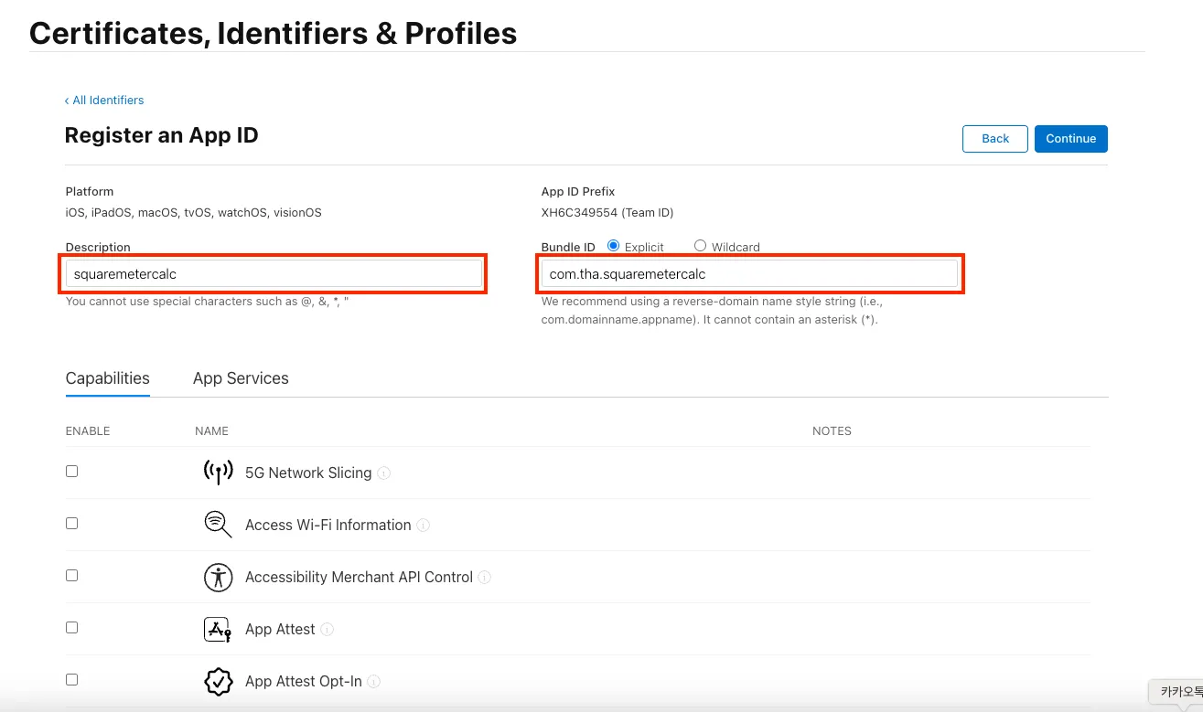 6. Register an App ID 내에 Description, Bundle ID를 입력합니다