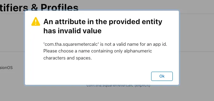 💡 An attribute in the provided entity has invalid value - 'com.tha.squaremetercalc' is not a valid name for an app id. Please choose a name containing only alphanumeric characters and spaces.