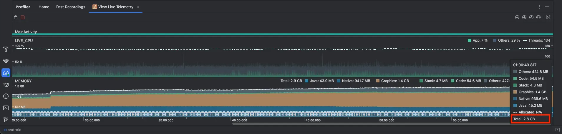 - 그러나 아래와 같이 앱의 코어 기능을 수행하면 아래와 같이 1시간이 지났을 때, 2.8GB가 증가가 됨을 확인하였습니다. - 아래의 주요 요소를 보면 Graphics 메모리의 값은 61MB → 1.4GB로 올라간 상황이었고 Native 메모리도 189MB → 939MB로 올라간 상황이었습니다.