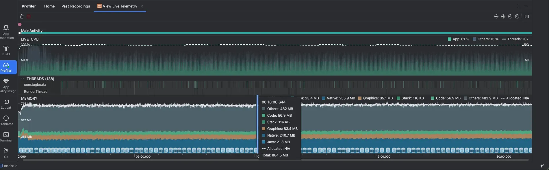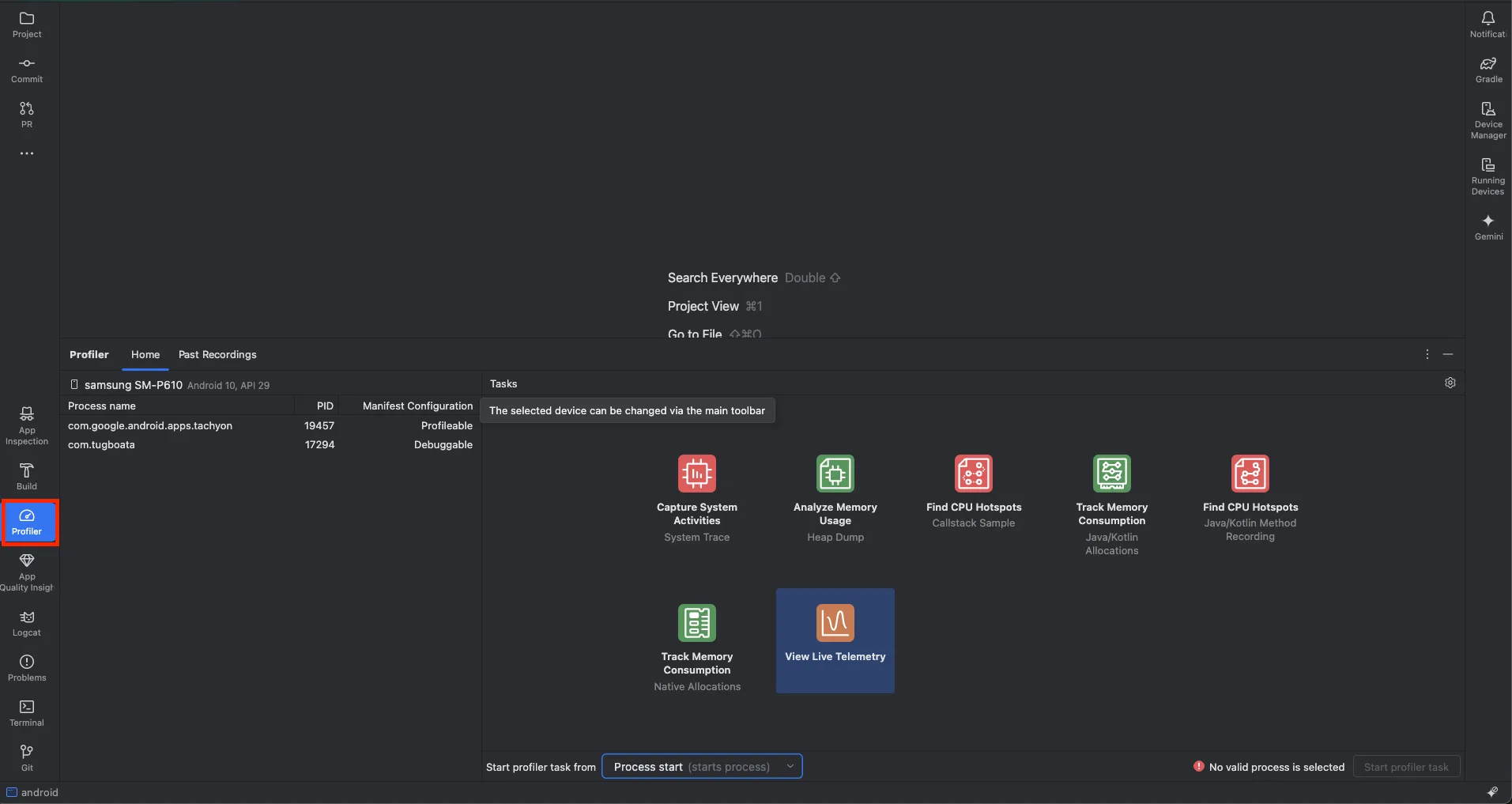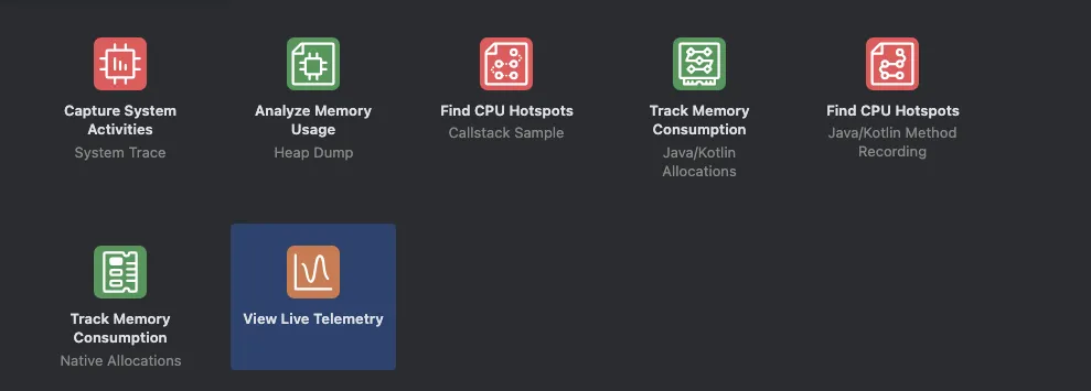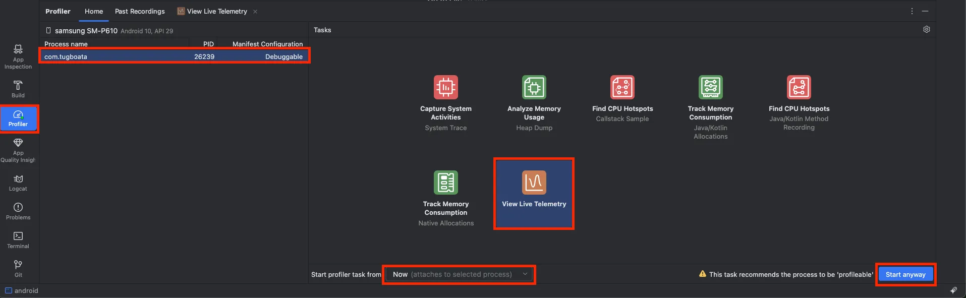 - Android Studio를 실행하고, Profiler 탭을 선택합니다. 그리고 연결된 앱을 선택 > View Live Telemetry > Start anyway를 선택합니다.