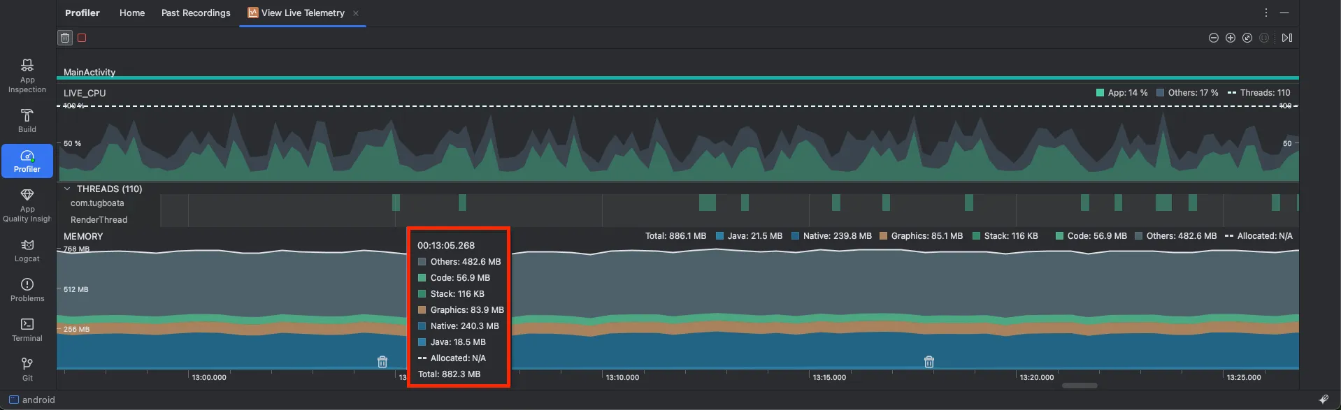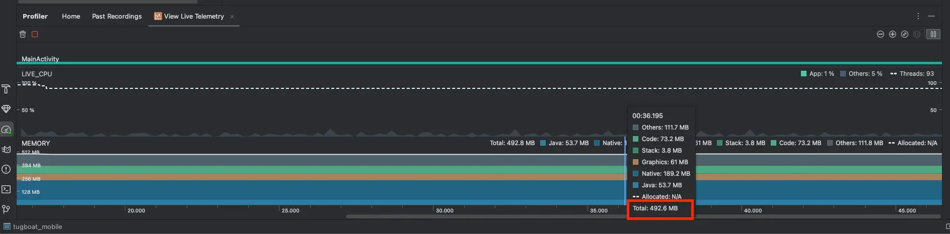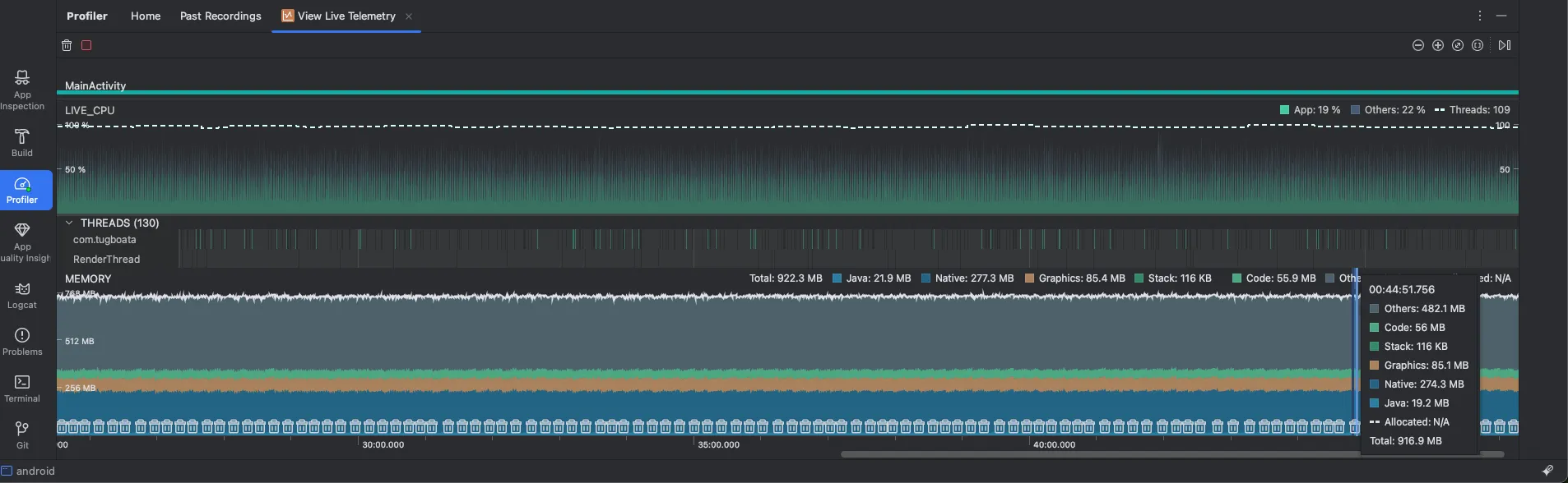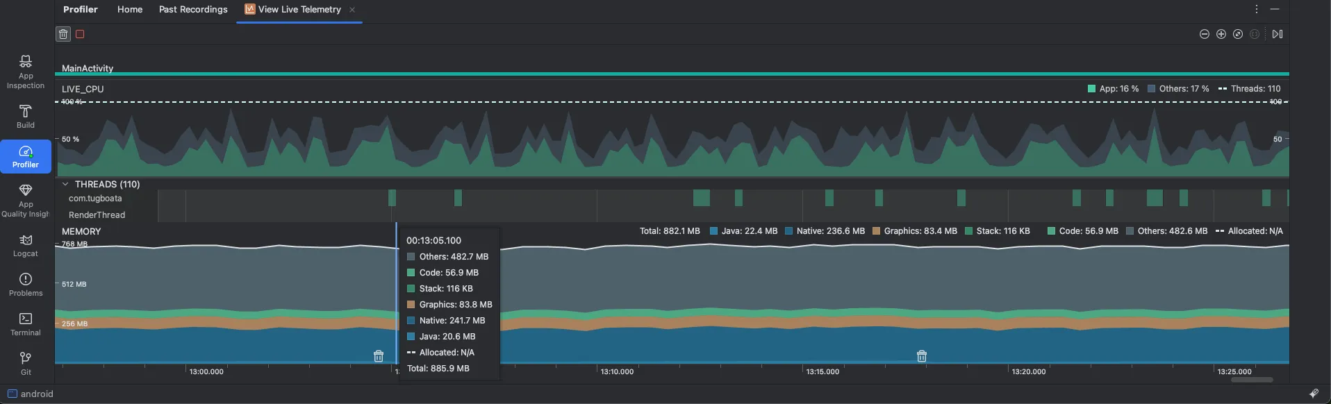 - Android Studio를 실행하고, Profiler 탭을 선택합니다. 그리고 연결된 앱을 선택 > View Live Telemetry > Start anyway를 선택합니다.