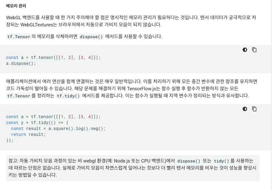 - 해당 역시도 @tensorflow/tfjs-react-native 라이브러리의 expo-gl을 이용하고, 백엔드를 rn-webgl을 사용하였기에 그래픽 메모리를 사용함에 따라 증가함을 확인하였습니다. - 역시 위에와 같이 webgl을 이용하면서 해당 메모리 관리를 수행하지 않아서 메모리가 급격하게 증가하는 문제였습니다.
