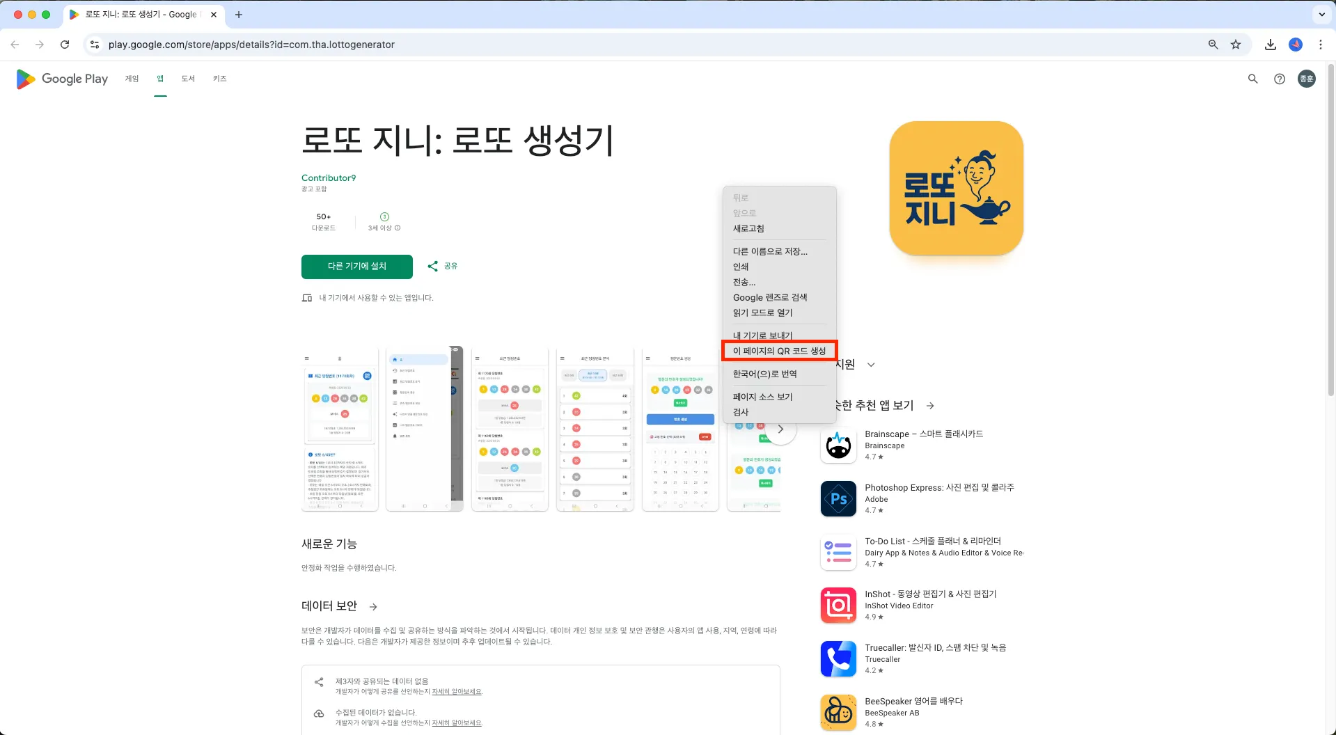 2. 해당 페이지에서 오른쪽 마우스를 누른 뒤 ‘이 페이지의 QR 코드 생성’ 버튼을 누릅니다.