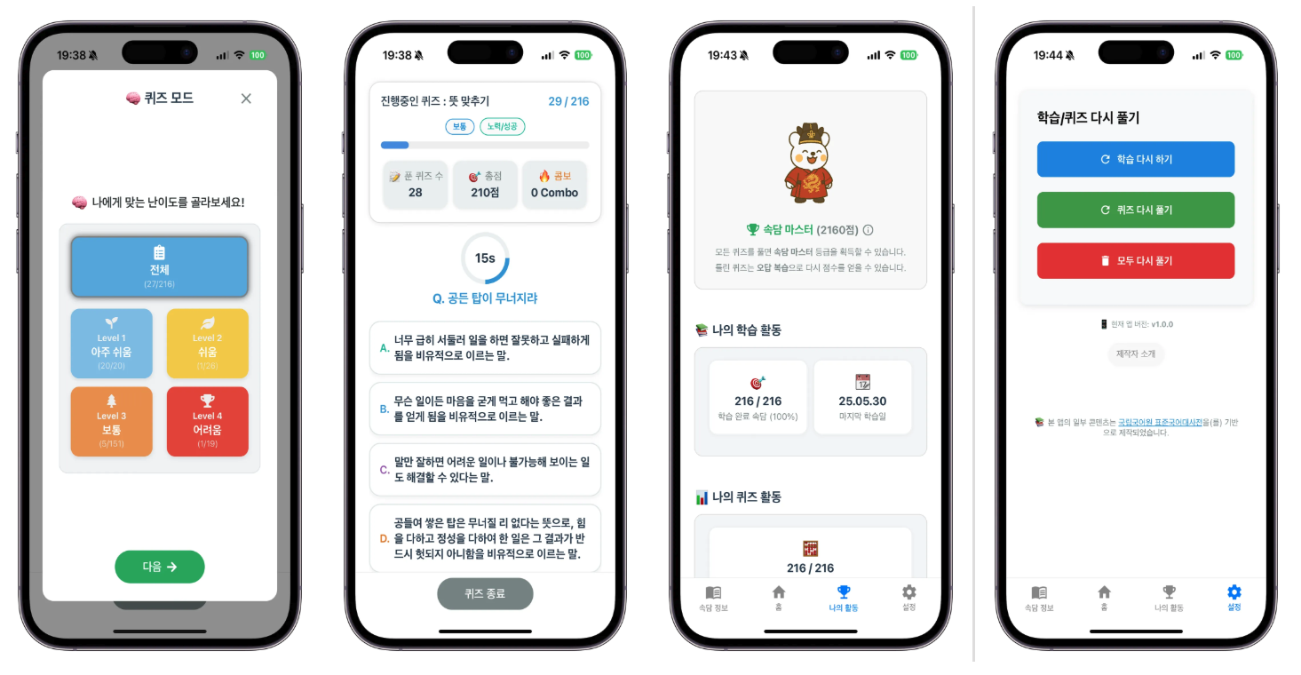 🔹 퀴즈 모드 - 4지선다형 속담 퀴즈 제공 - 속담 뜻 맞추기 / 속담 찾기 / 빈칸 채우기 - 정답 시 점수와 콤보 누적, 다양한 뱃지 보상 제공