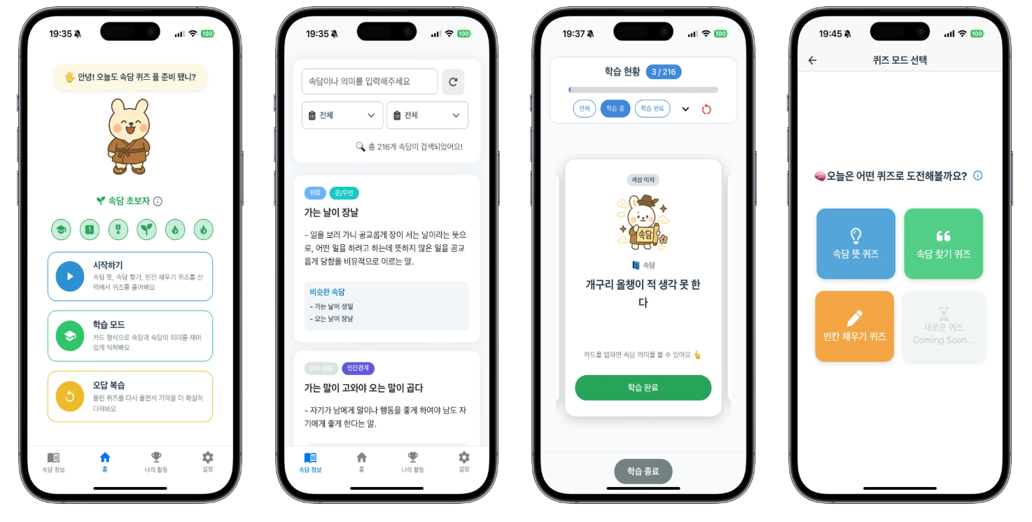 🔹 학습 모드 - 카드 형식으로 속담을 쉽고 재미있게 학습 - 난이도, 카테고리, 학습 상태별 필터 제공 - 의미와 비슷한 속담도 함께 학습 가능