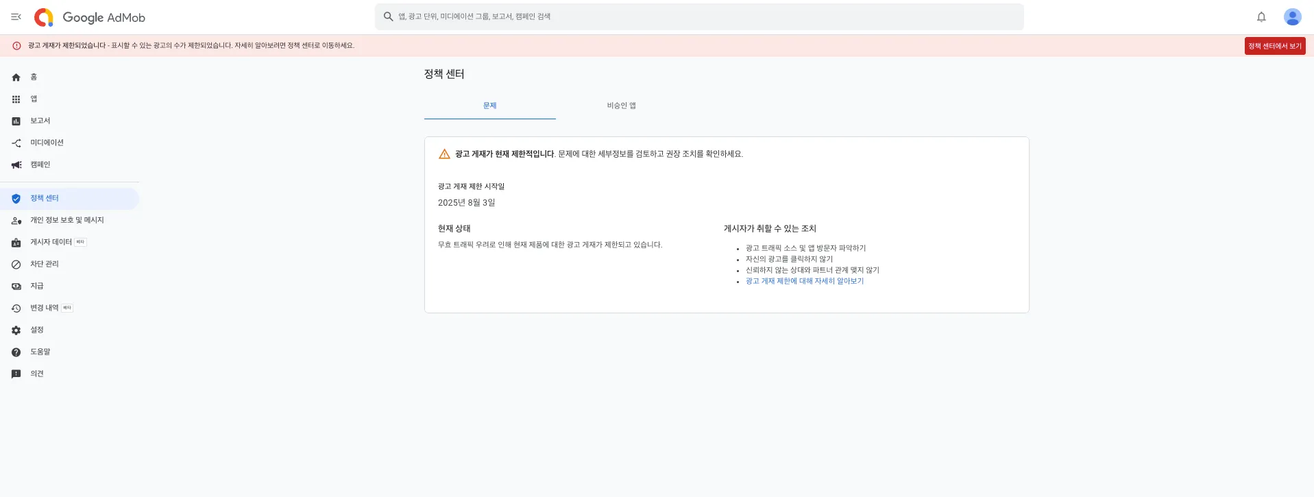 💡 구글 애드몹: 광고 게재가 현재 제한적입니다. 무효 트래픽 우려로 인해 현재 제품에 대한 광고 게재가 제한되고 있습니다.