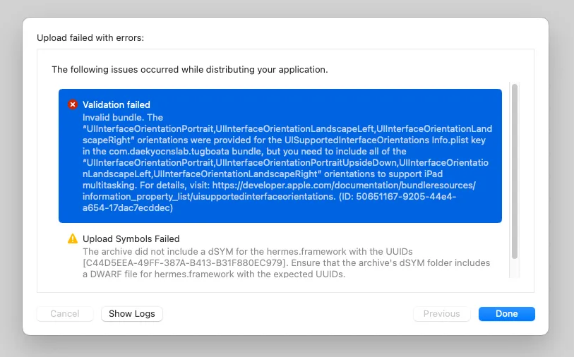 💡 해결방법 - 현재 Info.plist → UISupportedInterfaceOrientations에 Portrait, LandscapeLeft, LandscapeRight만 있음이 확인이 되었습니다. 하지만 iPad 멀티태스킹 지원 앱이라면 PortraitUpsideDown 도 무조건 추가해야 한다는 규칙이 있습니다.