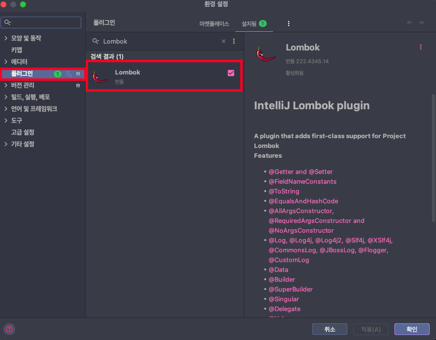 💡 IntelliJ 이하 버전인 경우 File - Proferences… - plugin - Lombok을 선택하여 설치 혹은 활성화를 합니다.