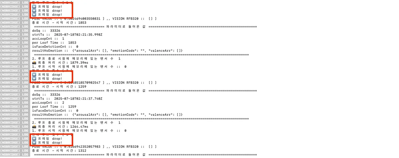 - 말 그대로, 프레임을 전달받는 JS 함수 내에서 Frame Drop을 수행합니다. 즉, 연산처리가 완료되지 않았다면 다음 frame을 JS 내에서 전달받지 않는 방식입니다. - isProcessingRef로 상태 관리를 하고, 수행이 완료될 때까지, 상태를 받지 않고, 도중에 들어온 값에 대해서는 frame drop을 수행합니다.