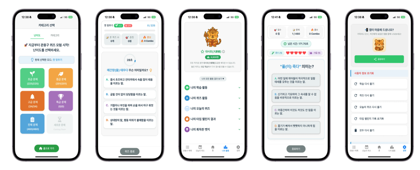 - 다양한 대한민국 관용구를 쉽고 재미있게 학습할 수 있도록 도와주는 학습형 퀴즈 앱입니다. 퀴즈를 통해 익힌 지식을 점검하고, 틀린 문제는 ‘오답 복습’ 기능으로 반복 학습할 수 있어 완벽한 관용구 마스터에 한 걸음 더 다가갈 수 있습니다.