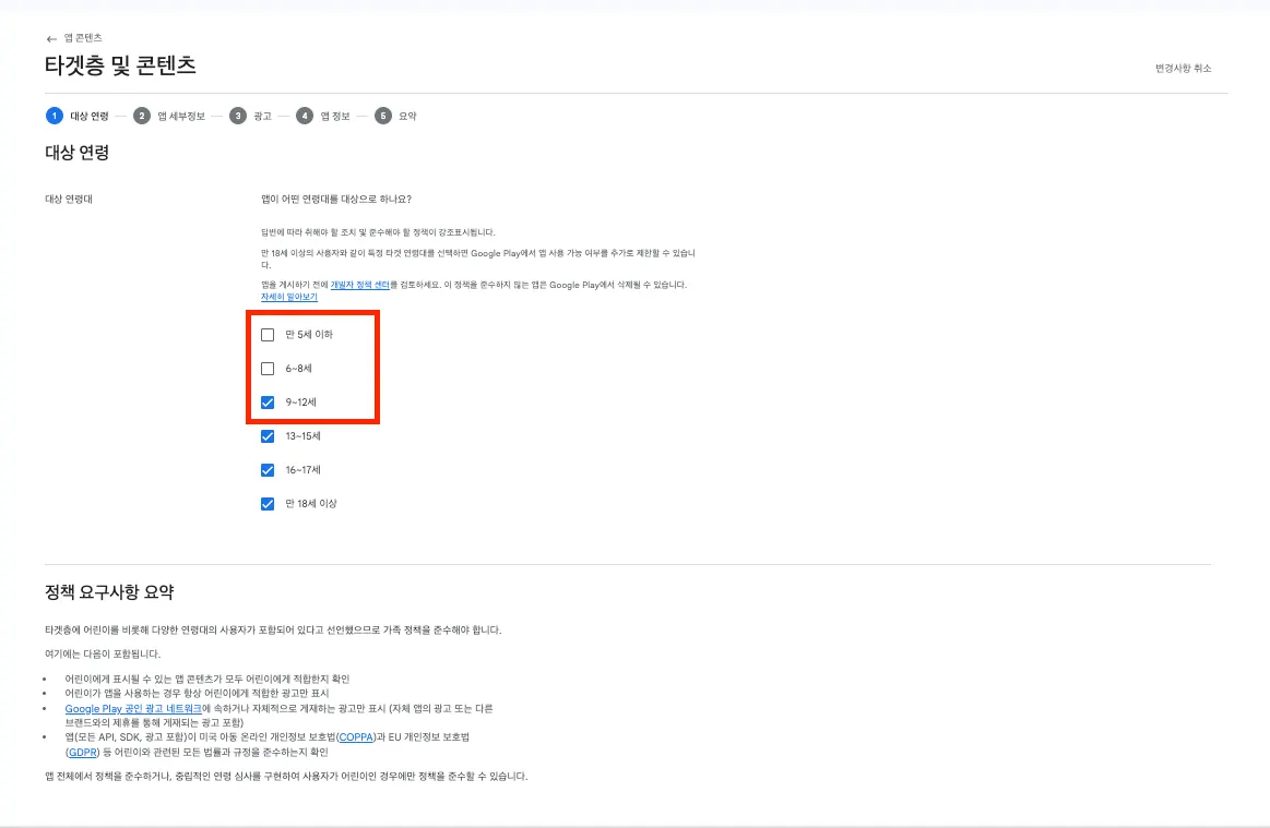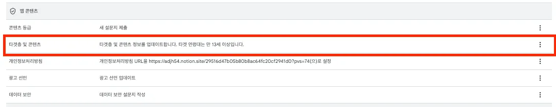 - 해당 경우는 구글 플레이 콘솔에서 설문지를 재 작성해서 13세 미만을 제외하면 됩니다.