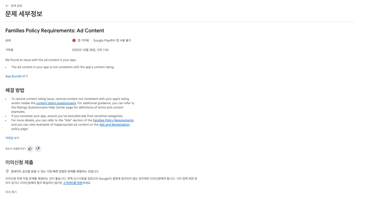 - 앱을 출시하는 과정에서 아래와 같은 문제가 발생하였습니다. - Families Policy Requirements: Ad Content 위와 같은 사항은 "앱의 광고 콘텐츠가 앱의 콘텐츠 등급과 일치하지 않습니다."라는 문제였습니다.