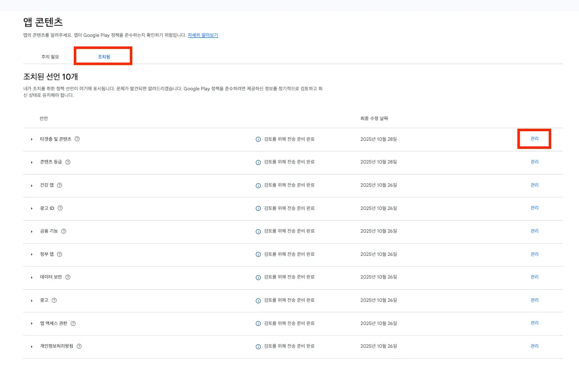 1. 구글 플레이 콘솔 > 정책 및 프로그램 > 앱 콘텐츠를 선택합니다