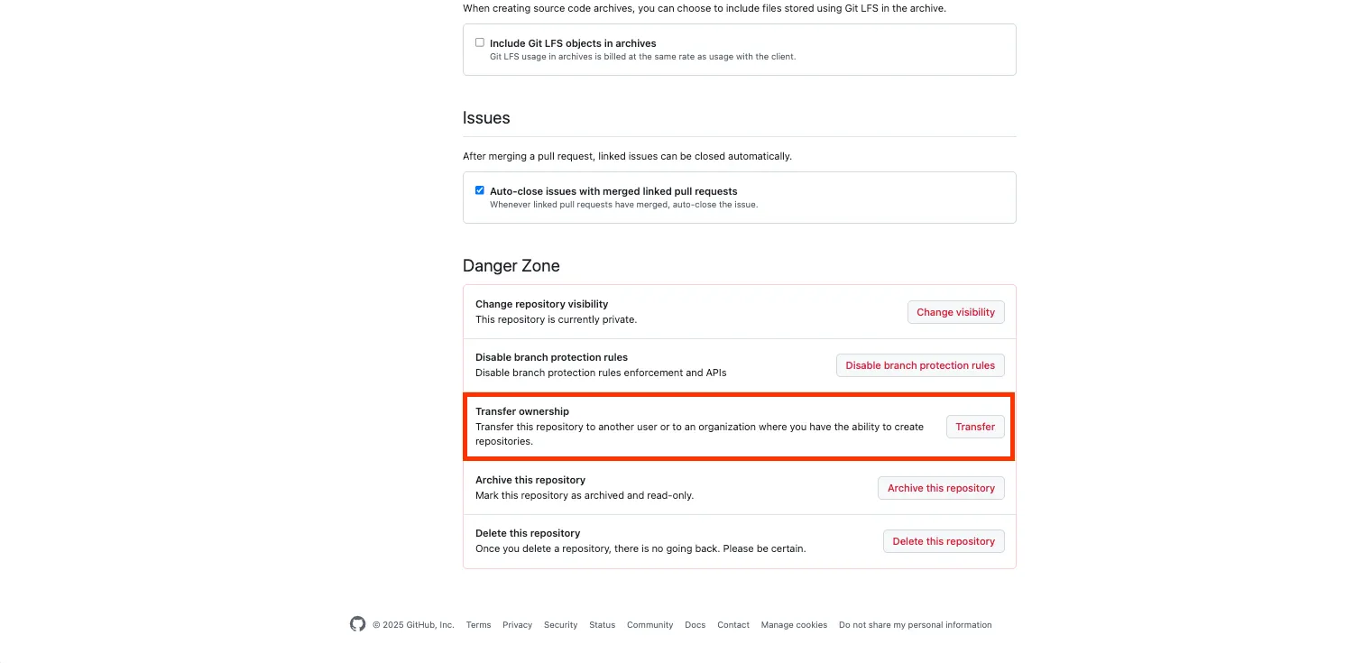이 저장소 이전을 수락하면 다음에 대한 액세스 권한을 잃게 됩니다. - 코드 소유자 기능. - 기존 위키. - 인사이트 페이지의 펄스, 기여자, 커뮤니티, 트래픽, 커밋, 코드 빈도 및 네트워크. - 초안 PR. - 문제 및 PR에 대한 여러 담당자. - 다수의 PR 리뷰어. - 분기 및 태그 보호 규칙. - 기존 페이지. 액세스 권한을 잃지 않으려면 이 저장소의 전송을 수락하기 전에 계획을 업그레이드할 수 있습니다. 이전을 수락하려면 다음 링크를 방문하세요. 이전을 수락하지 않으면 약 하루 후에 만료됩니다. 질문? 문제가 있나요? 언제든지 https://support.github.com을 방문해 주세요. 감사해요, GitHub의 친구들