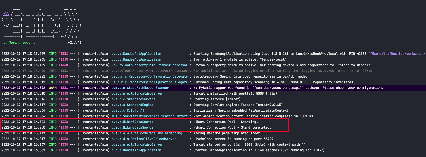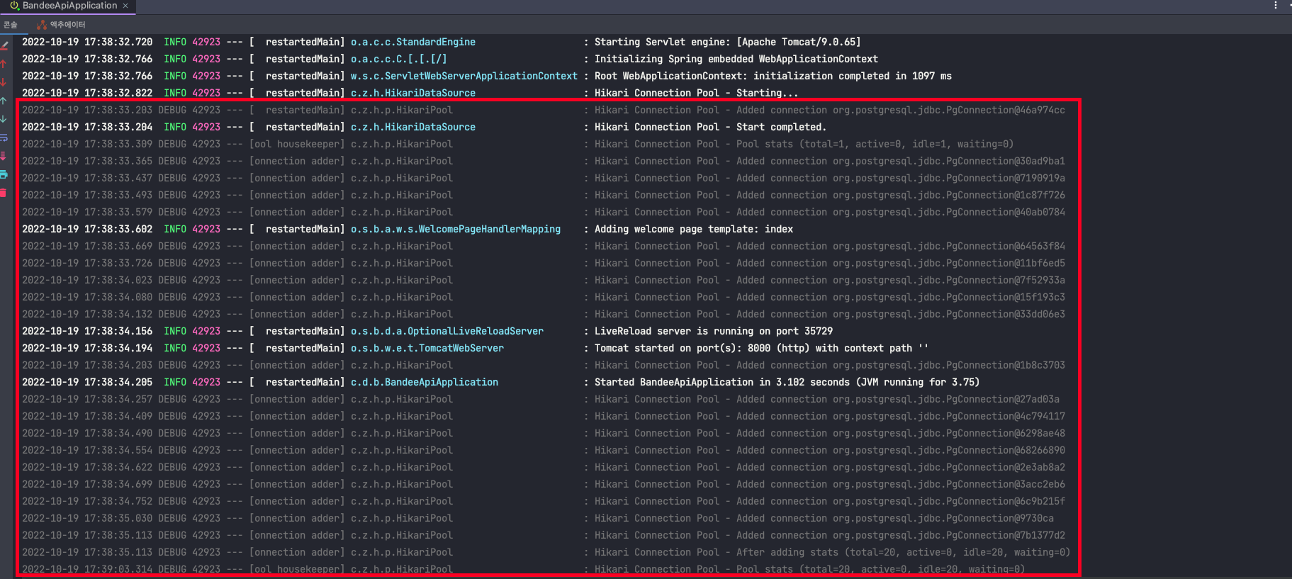 💡 서버가 동작하는 동시에 HikariCP가 시작되는 것을 확인할 수 있습니다.