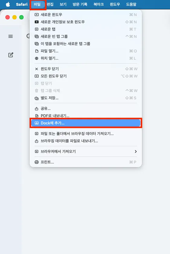 2. 상단 메뉴에서 파일 > Dock에 추가.. 버튼을 누릅니다.