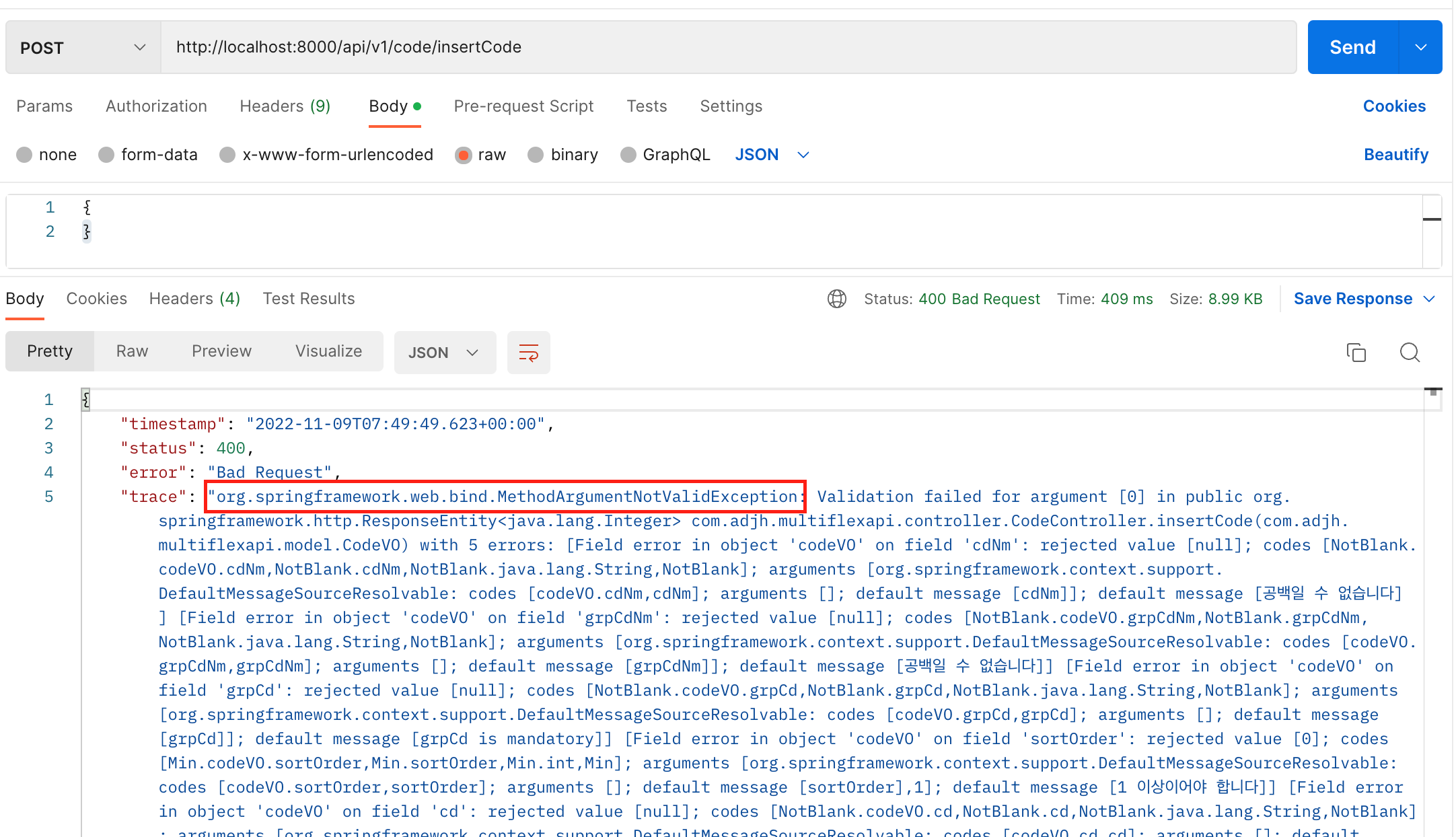 "message": "Validation failed for object='codeVO'. Error count: 5",