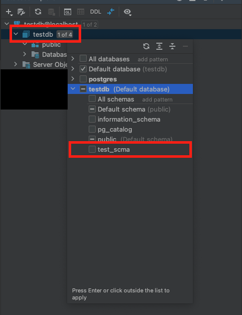 - IDE 툴을 종료하고 재시작하여 public에 대해 체크해제를 하고 test_scma를 선택하면 default schema로 변경됨을 확인하였습니다.