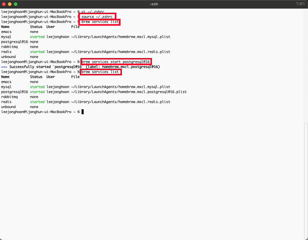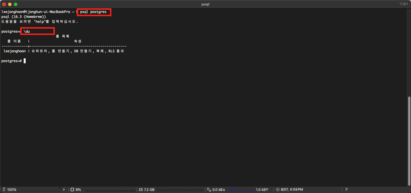 💡 서비스를 시작시키면 PostgreSQL을 Terminal에서 사용 가능합니다. PosgreSQL을 접속하여 사용자를 확인합니다.