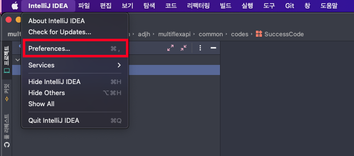 1. IntelliJ IDEA - Preference… 를 선택합니다.