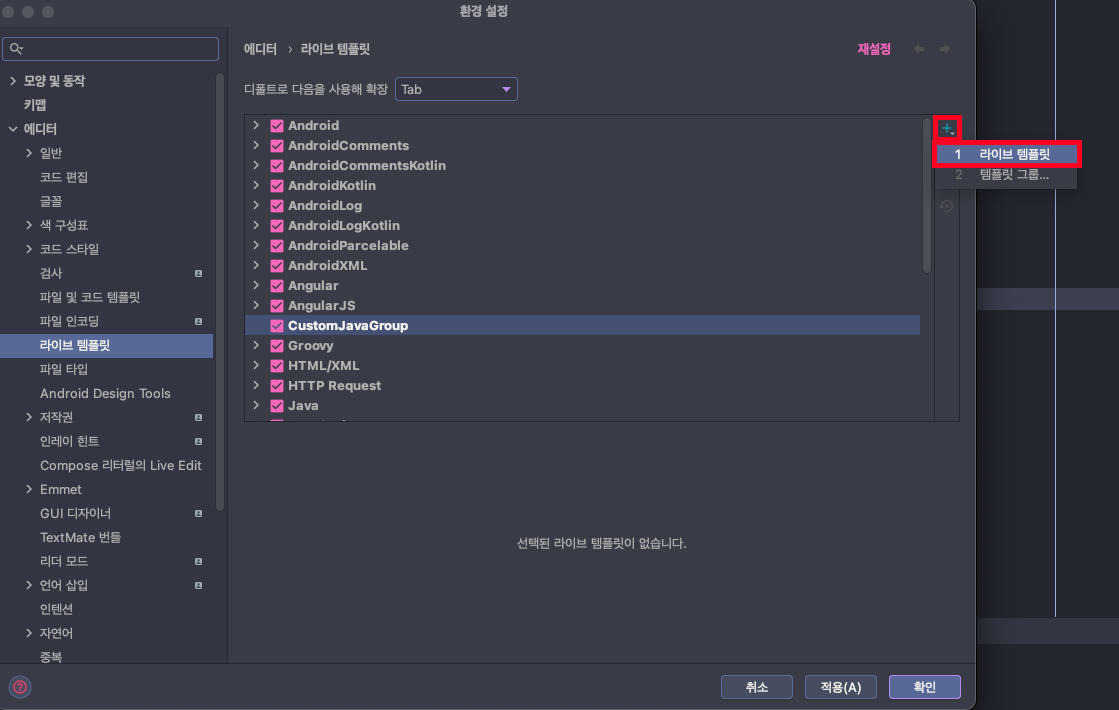 4. 생성된 그룹을 선택한 뒤 “+” 버튼을 누르고 “라이브 템플릿”을 선택합니다